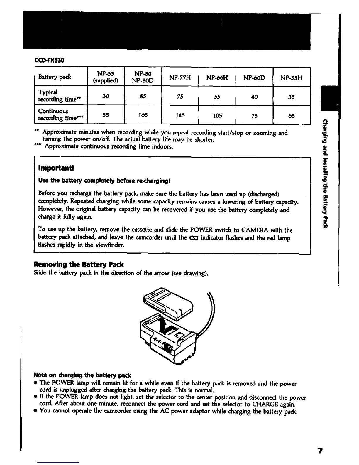 Sony Handycam CCD-FX430 - Removing the Battery Pack; Note on Charging the Battery Pack