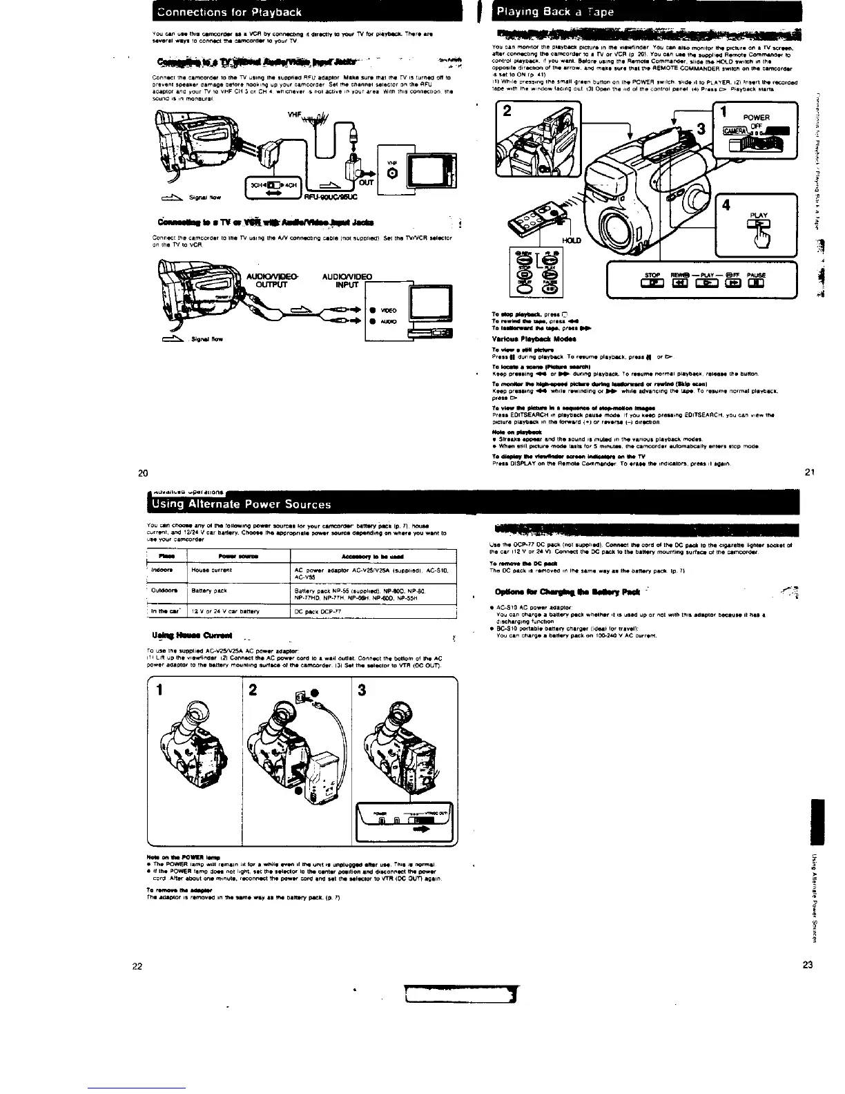Sony Handycam CCD-TR21 - Connections for Playback; Playing Back a Tape; Using Alternative Power Sources; Using House Current