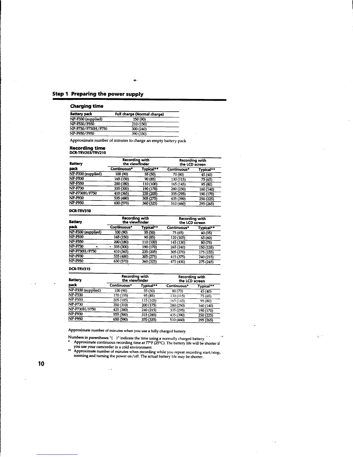 Sony Handycam DCR-TRV310 - Charging Time; Recording Time