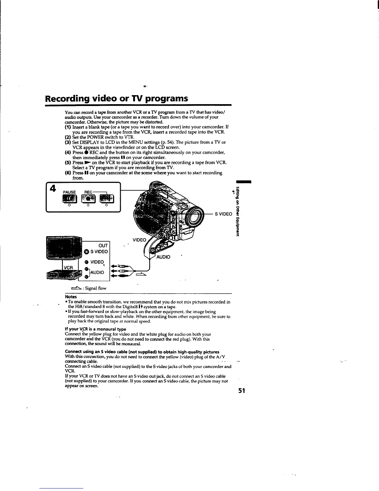 Sony Handycam DCR-TRV310 - Recording Video or TV Programs; If Your VCR Is a Monaural Type; Connect Using a S Video Cable to Obtain High-Quality Pictures