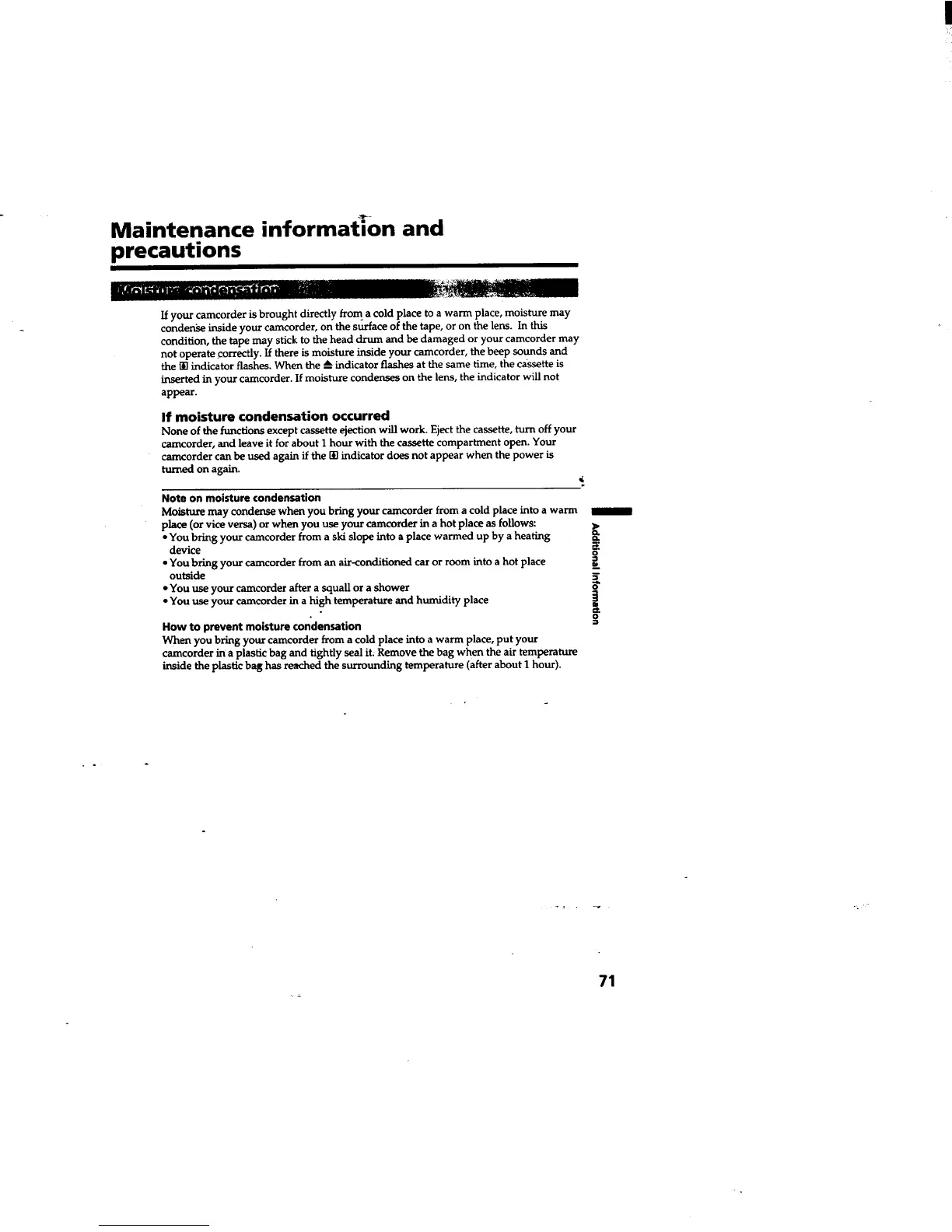 Sony Handycam DCR-TRV310 - Maintenance Information and Precautions; Moisture Condensation
