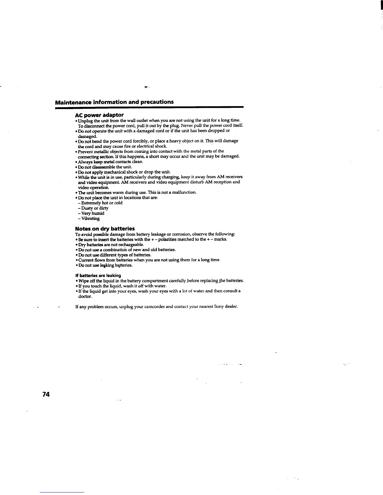 Sony Handycam DCR-TRV310 - AC Power Adaptor; Notes on Dry Batteries; If Batteries Are Leaking