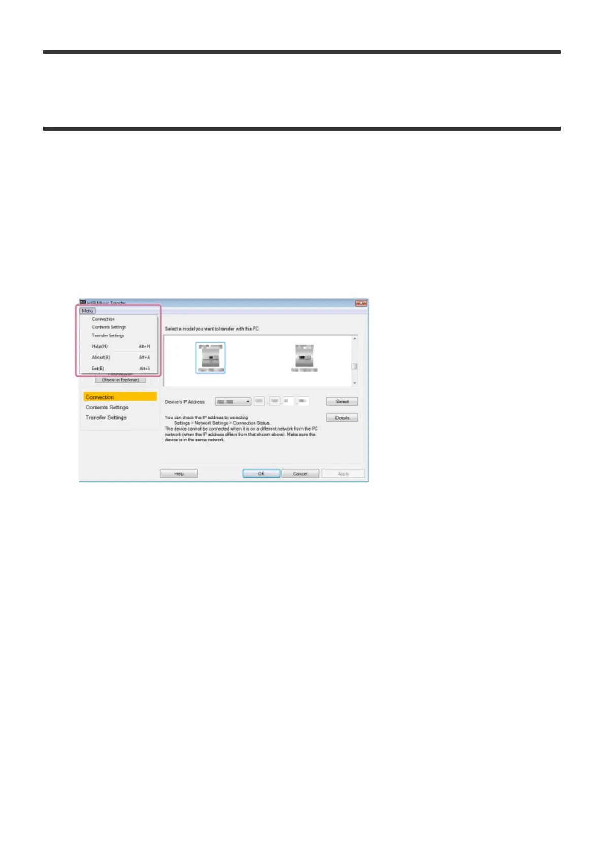 1. Select [Menu] in the Connection, Contents Settings or Transfer Settings