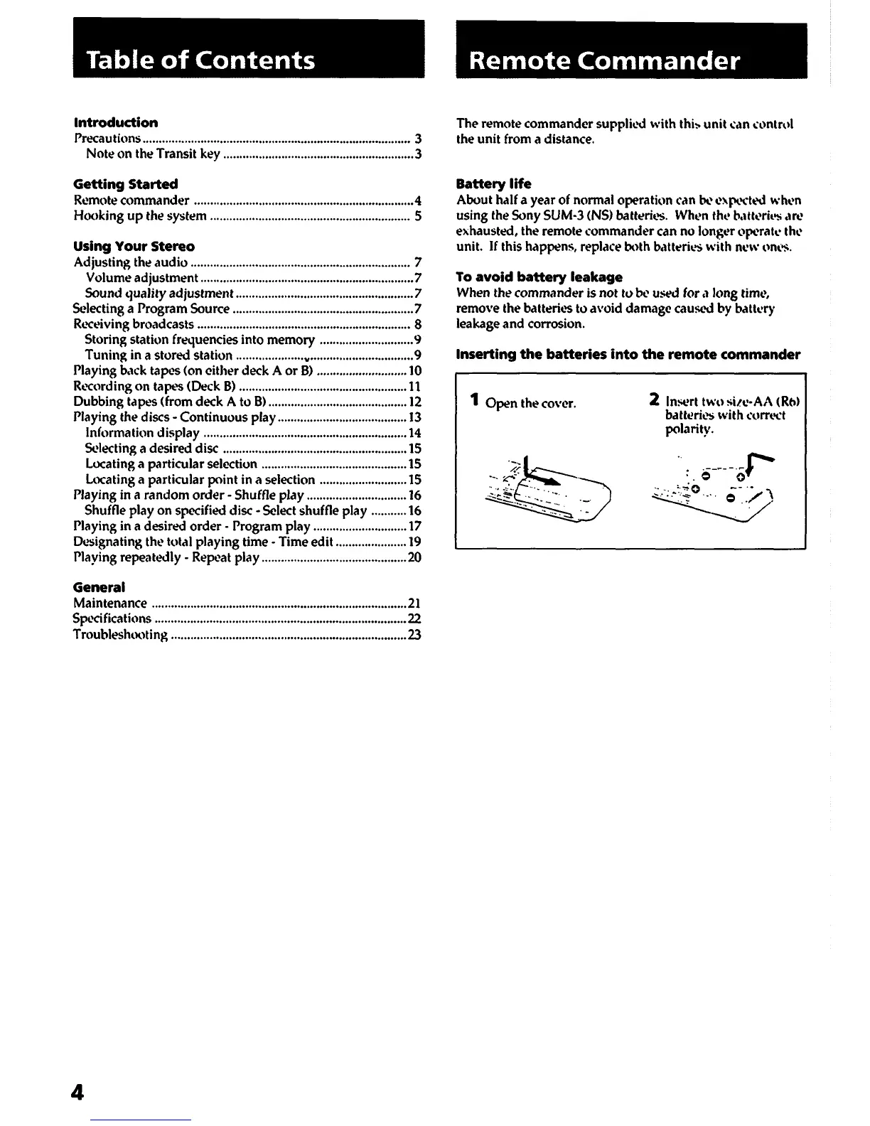 Sony HCD-241 Primary - Remote Commander; Battery Life and Care; Inserting Remote Batteries
