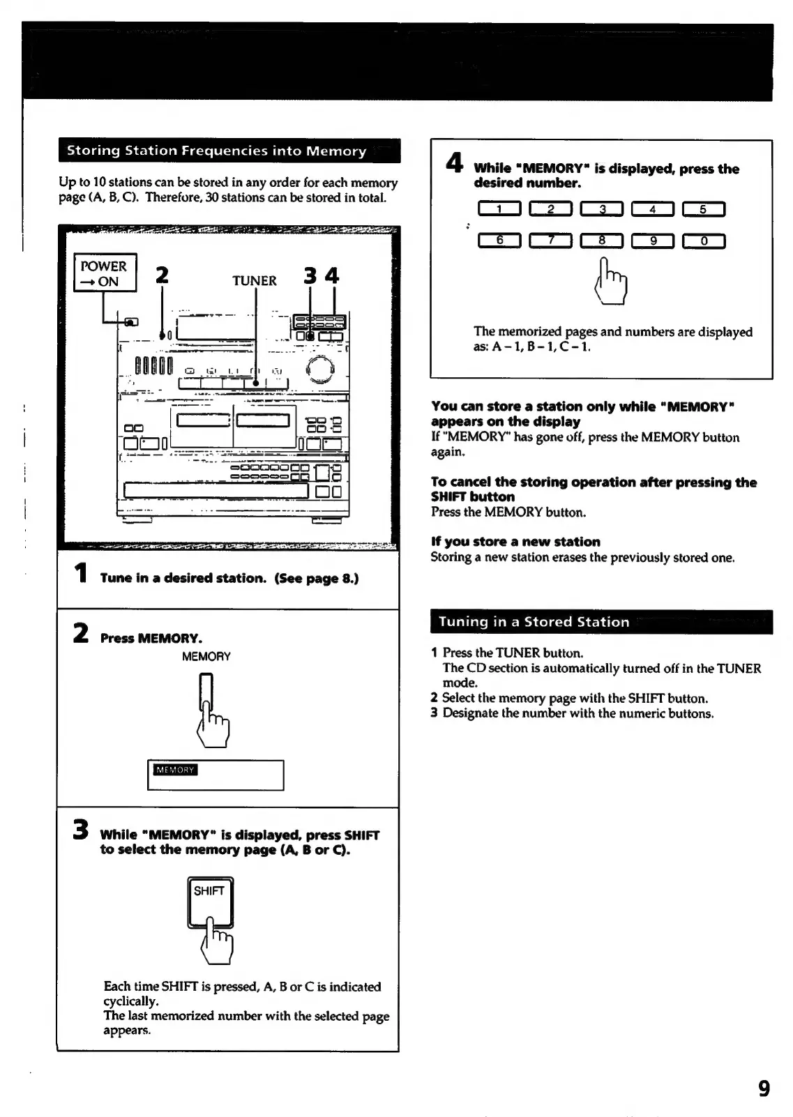 Sony HCD-241 - Storing Station Frequencies into MEMOTY; Tuning in a Stored Station