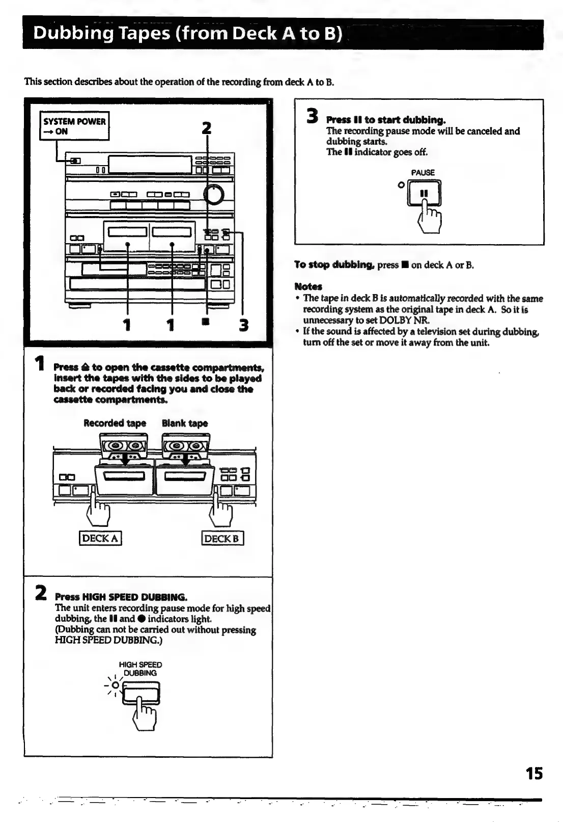 Sony HCD-441 - Dubbing Tapes (from Deck A to B); Loading Tapes for Dubbing; Activating High Speed Dubbing; Starting Tape Dubbing