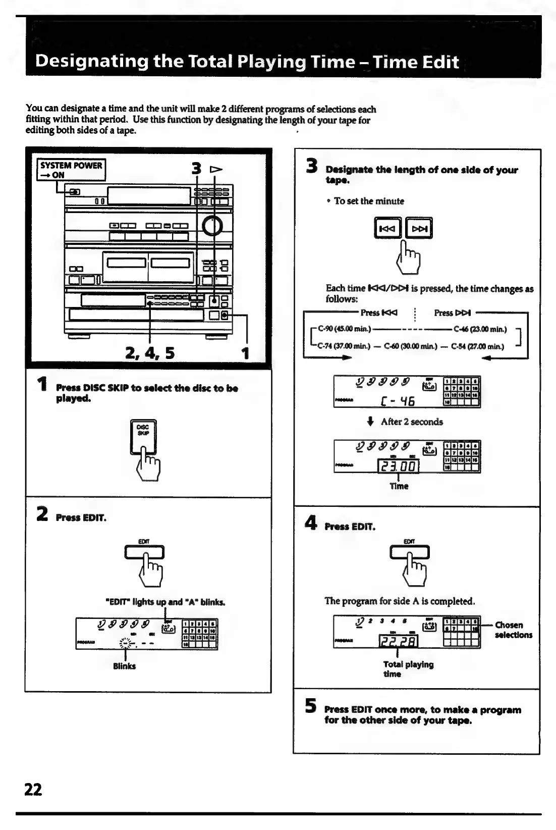 Sony HCD-441 - Designating the Total Playing Time - Time Edit; Selecting Disc for Editing; Activating Edit Mode; Setting Tape Length