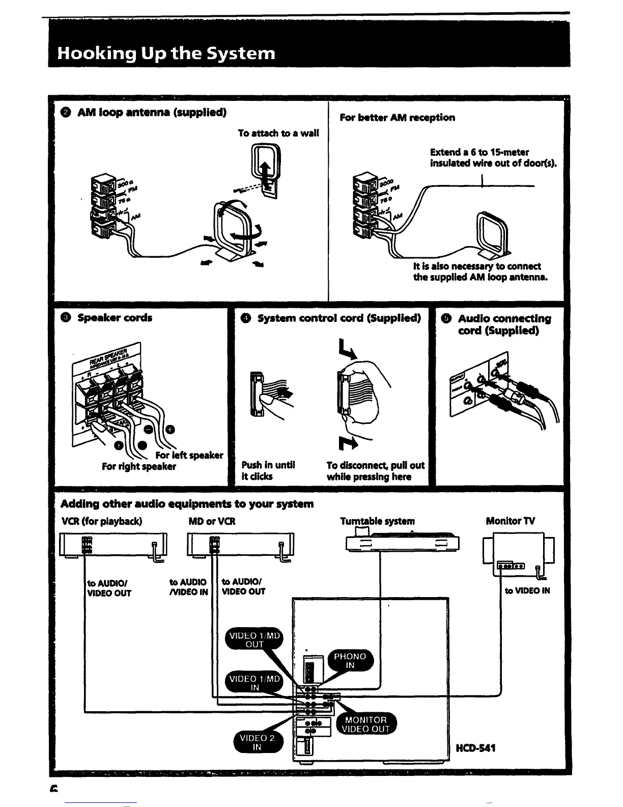 Sony HCD-541 Primary - AM Loop Antenna; Speaker Cords; System Control Cord; Audio Connecting Cord
