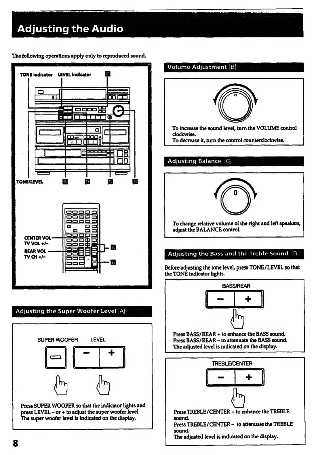 Sony HCD-541 - Adjusting the Audio; Adjusting the Super Woofer Level; Volume Adjustment; Adjusting Balance