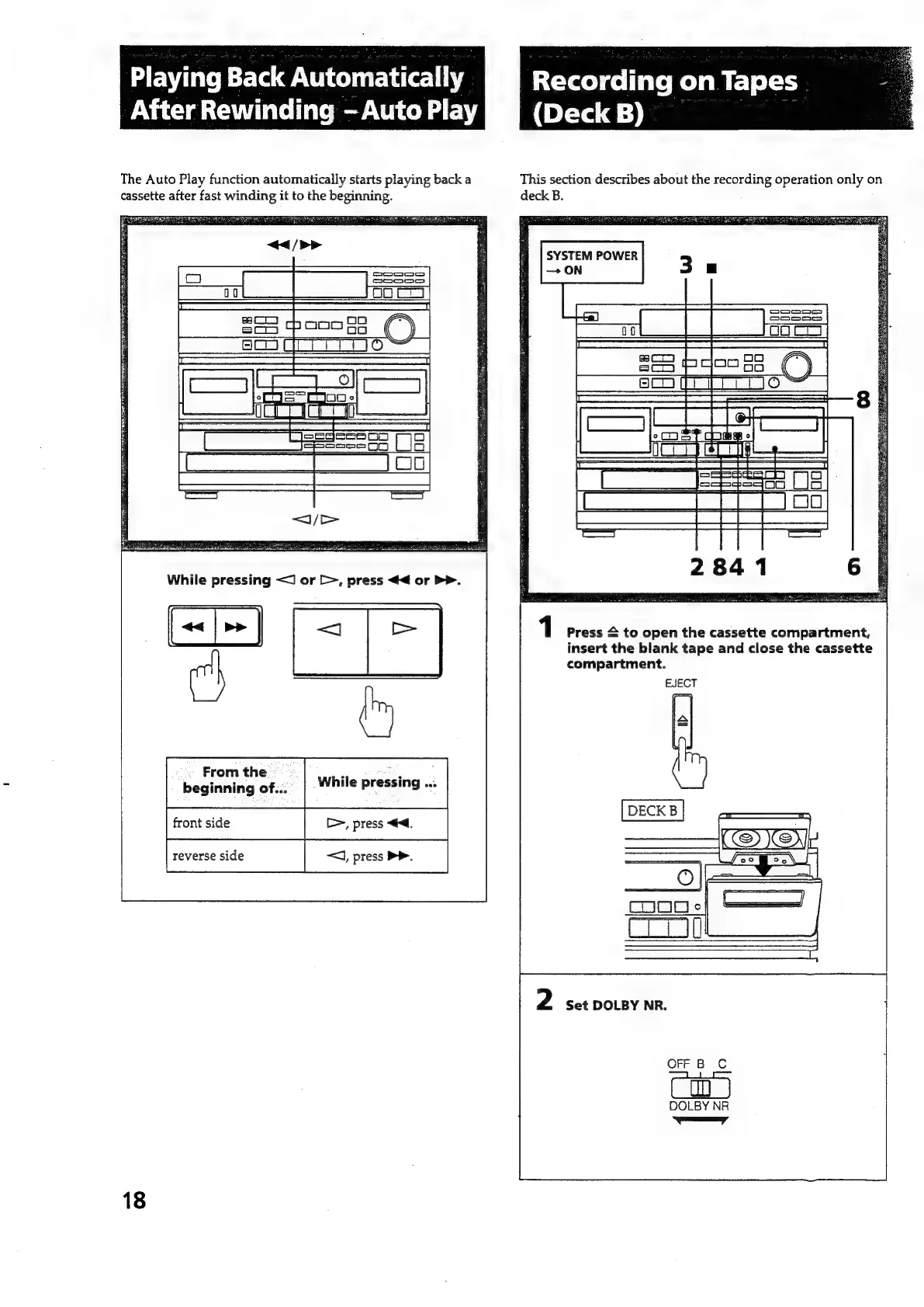 Sony HCD-551 - Auto Playback Feature; Automatic Playback After Rewind; Recording on Tapes (Deck B); Basic Recording Procedure