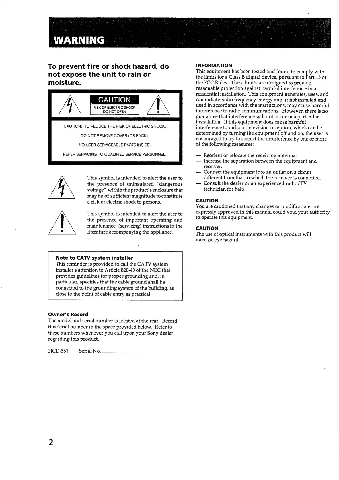 Sony HCD-551 - Warning and Safety Information; Electrical Safety and Hazard Warnings; Regulatory and Installer Notes