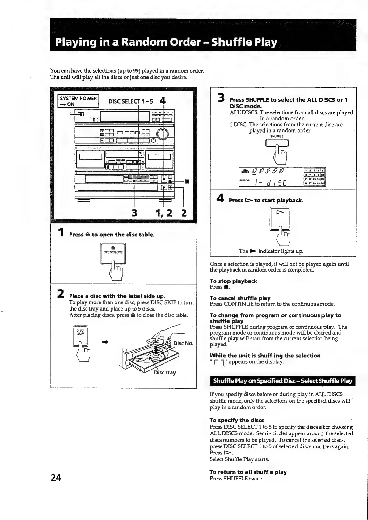 Sony HCD-551 - Shuffle Play - Random Order; Selecting Shuffle Play Modes; Starting and Cancelling Shuffle Play; Shuffle Play on Specified Discs
