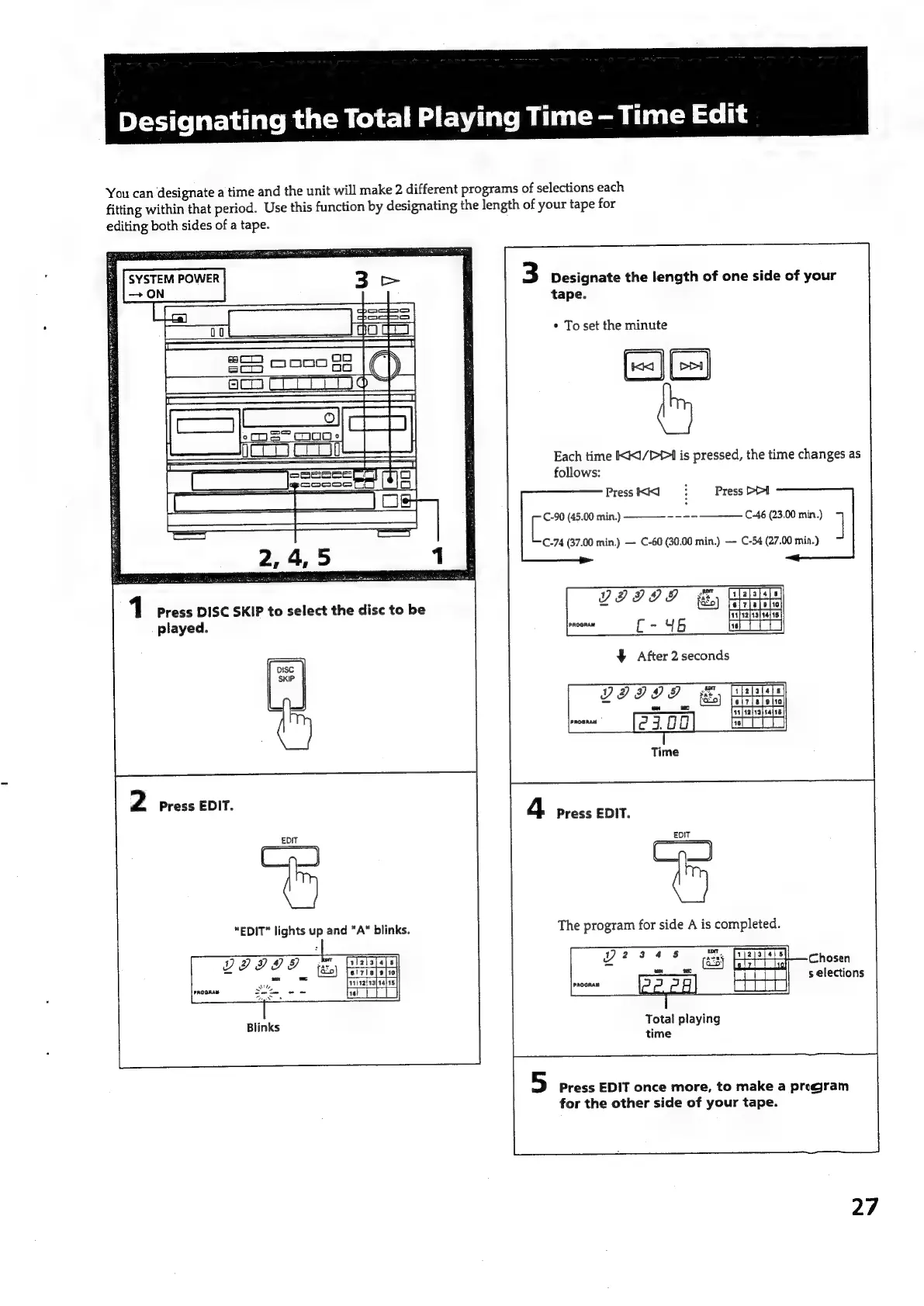 Sony HCD-551 - Time Edit - Designating Playing Time; Setting Tape Length for Editing; Completing Time Edit Programs