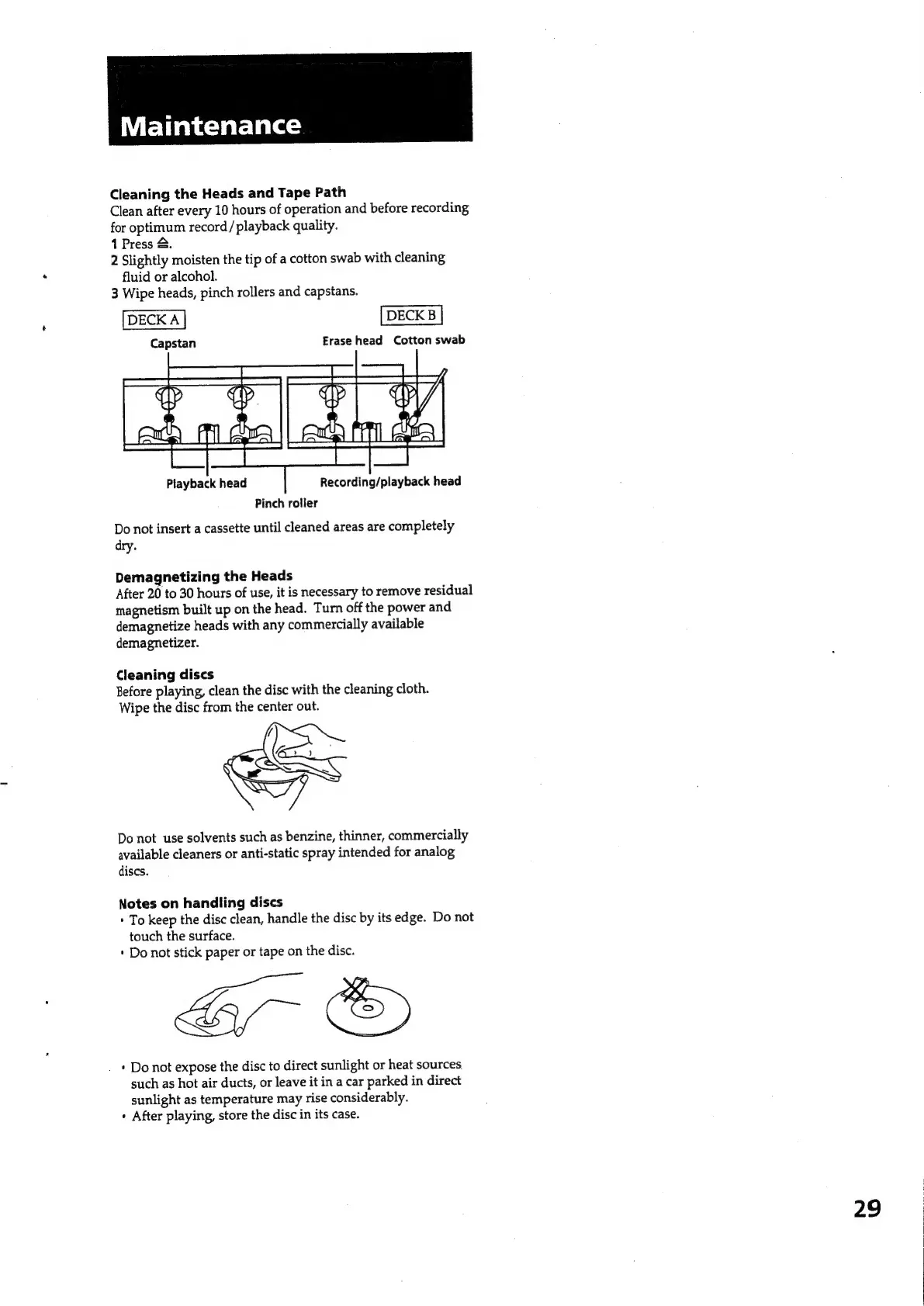 Sony HCD-551 - Maintenance; Cleaning Heads and Tape Path; Demagnetizing and Disc Cleaning; Handling Discs Safely
