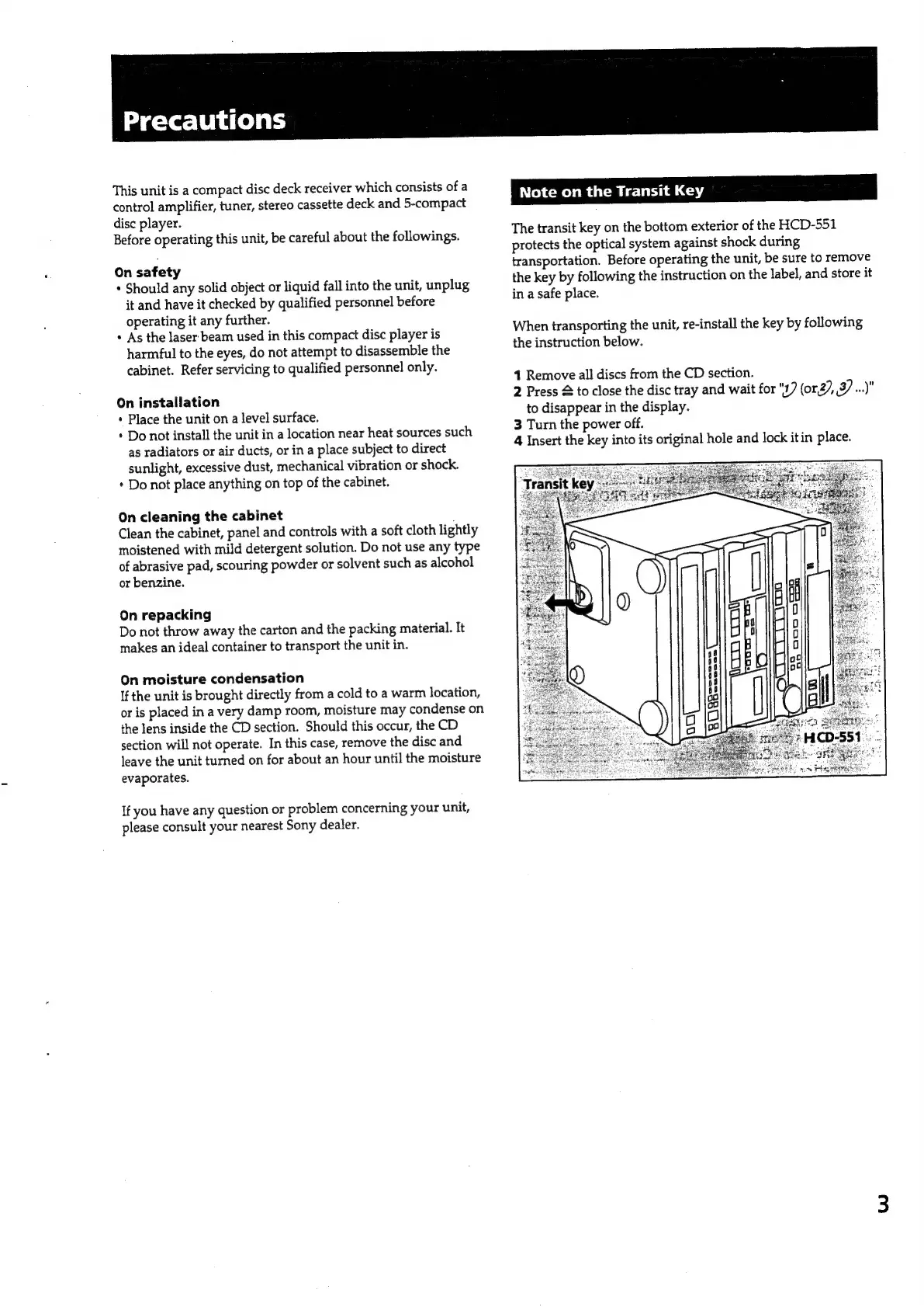 Sony HCD-551 - Precautions for Use and Handling; General Safety and Environment; Transit Key Operation