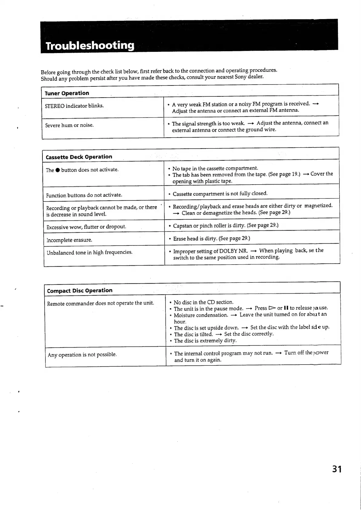 Sony HCD-551 - Troubleshooting Guide; Tuner Operation Issues; Cassette Deck Operation Problems; Compact Disc Operation Issues