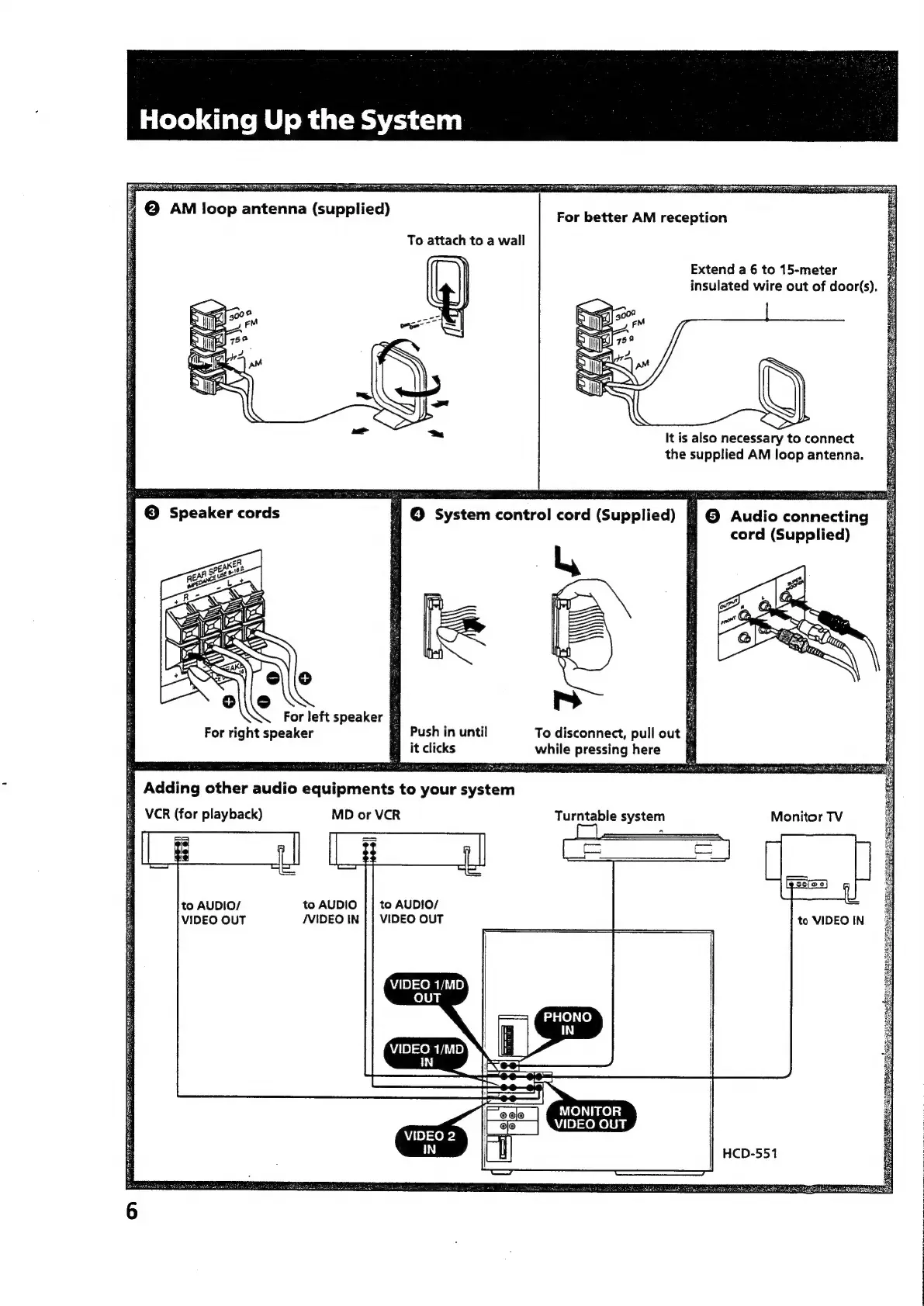 Sony HCD-551 - System Cords and Equipment Connection; Antenna, Control, and Audio Cords; Connecting External Audio Devices