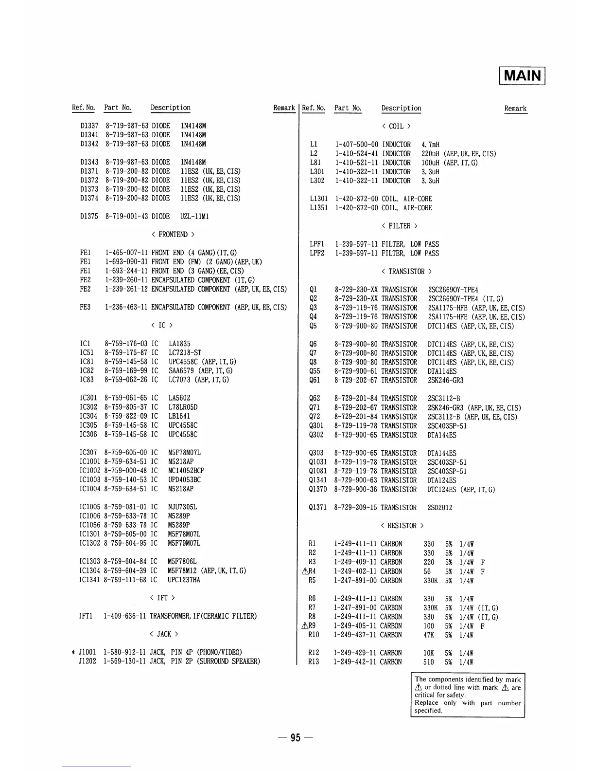 Sony HCD-A490 - ELECTRICAL PARTS LIST (Main Board - Cont.); Main Board Parts List: ICs; Main Board Parts List: IFT; Main Board Parts List: Jacks