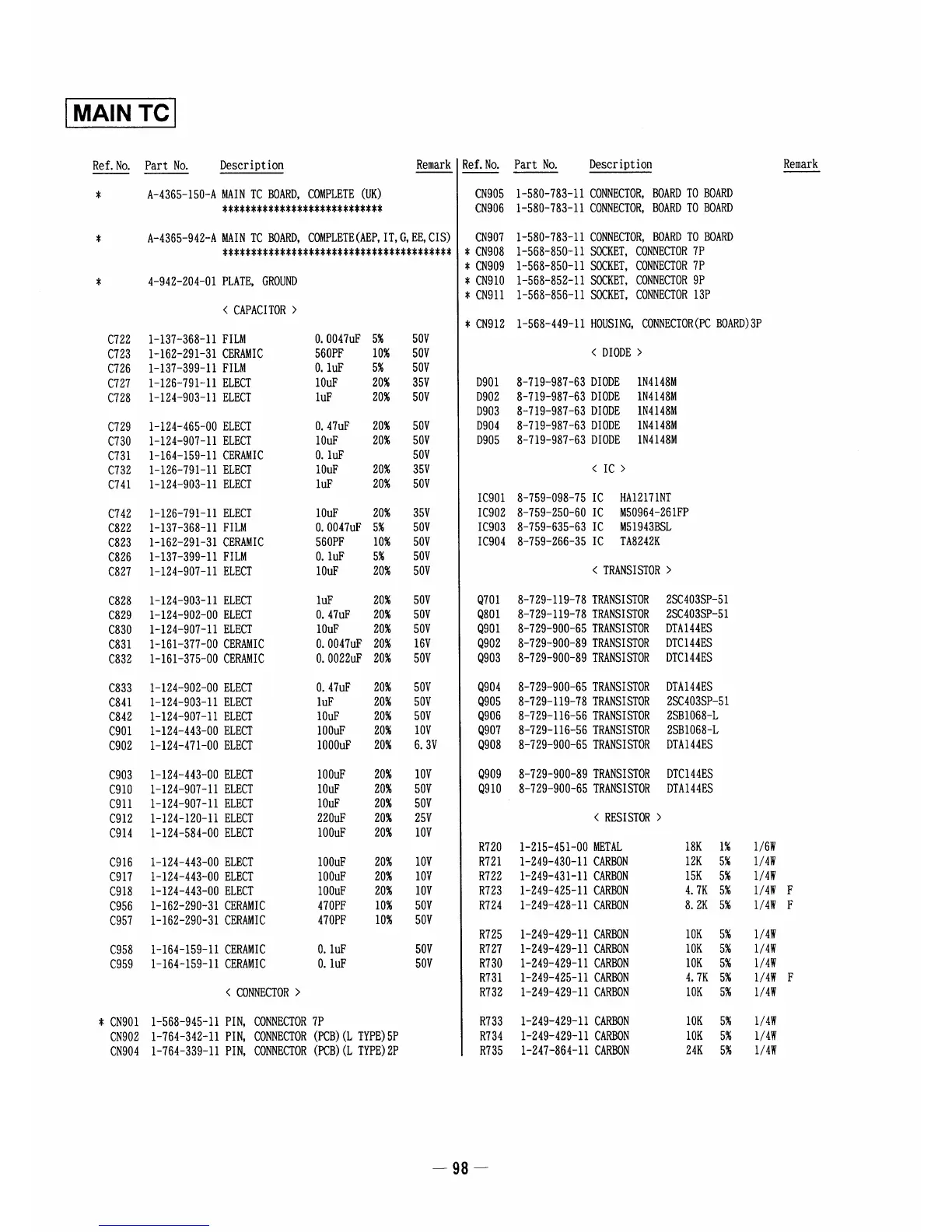 Sony HCD-A490 - ELECTRICAL PARTS LIST (Main TC Board); Main TC Board Parts List: Capacitors; Main TC Board Parts List: Connectors; Main TC Board Parts List: Diodes