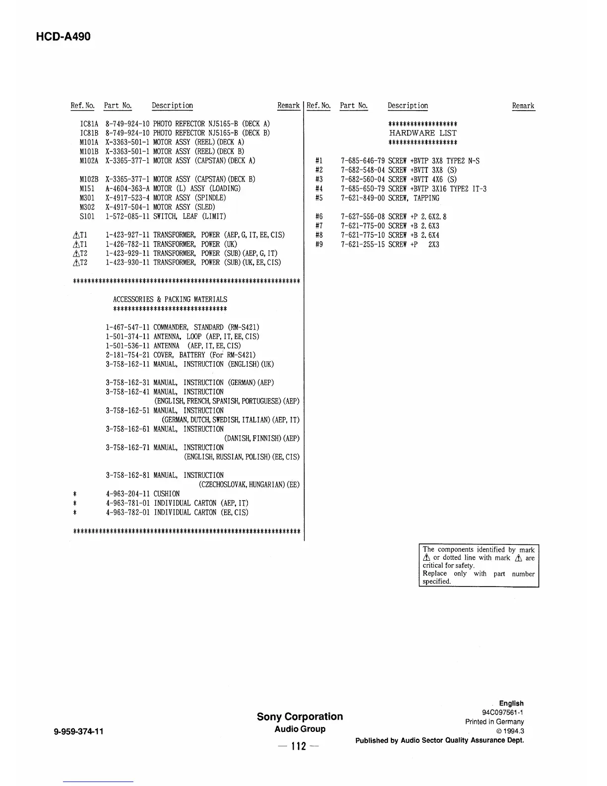 Sony HCD-A490 - ACCESSORIES & PACKING MATERIALS; Accessories and Packing Materials