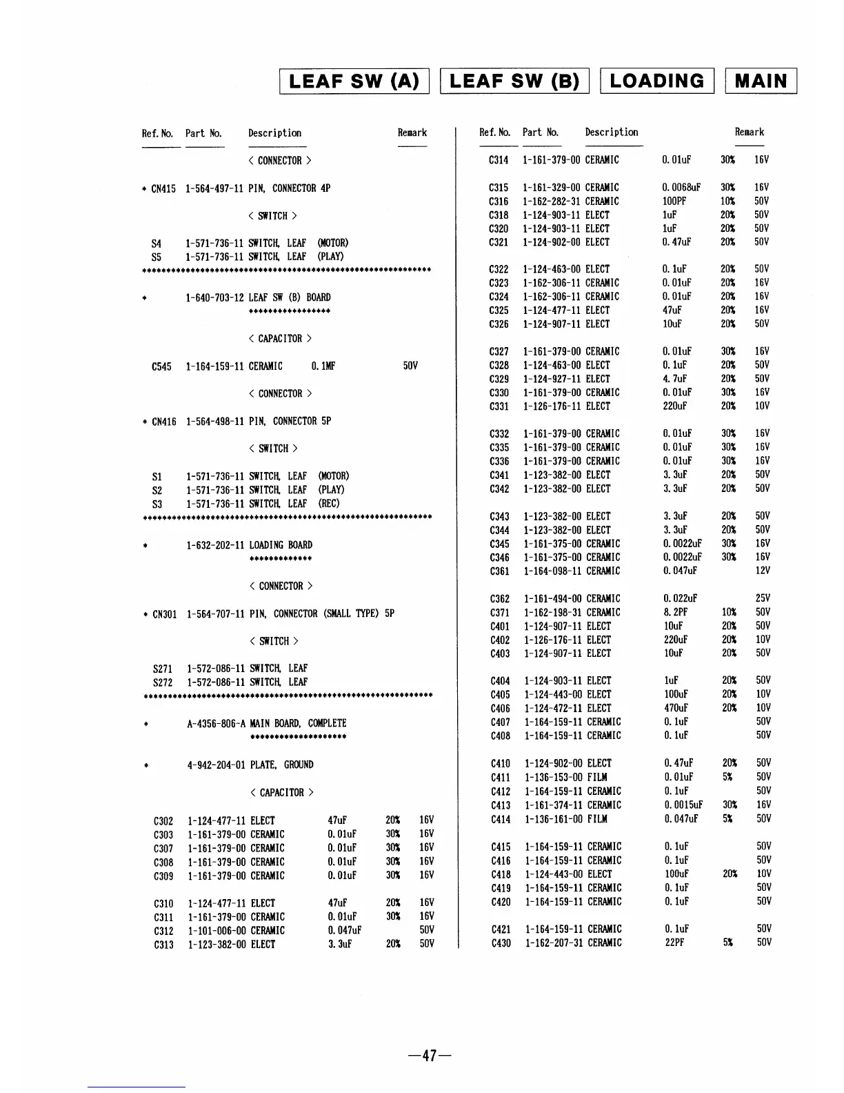 Sony HCD-D109 - Electrical Parts List - Leaf SW and Loading Sections; Leaf SW (A;B) Parts List; Loading Section Parts List
