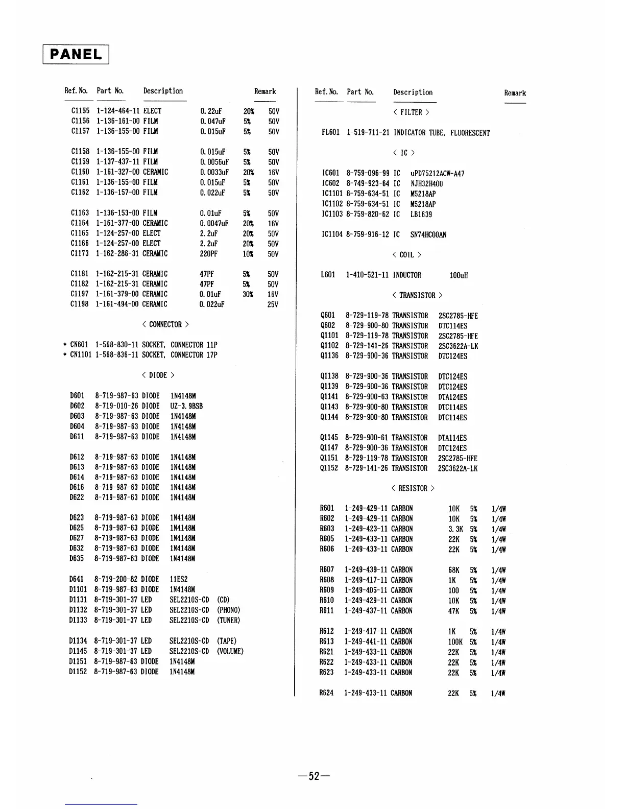 Sony HCD-D109 - Electrical Parts List - Panel Section; Panel Section Capacitor List; Panel Section Connector, Diode, IC, Coil Lists