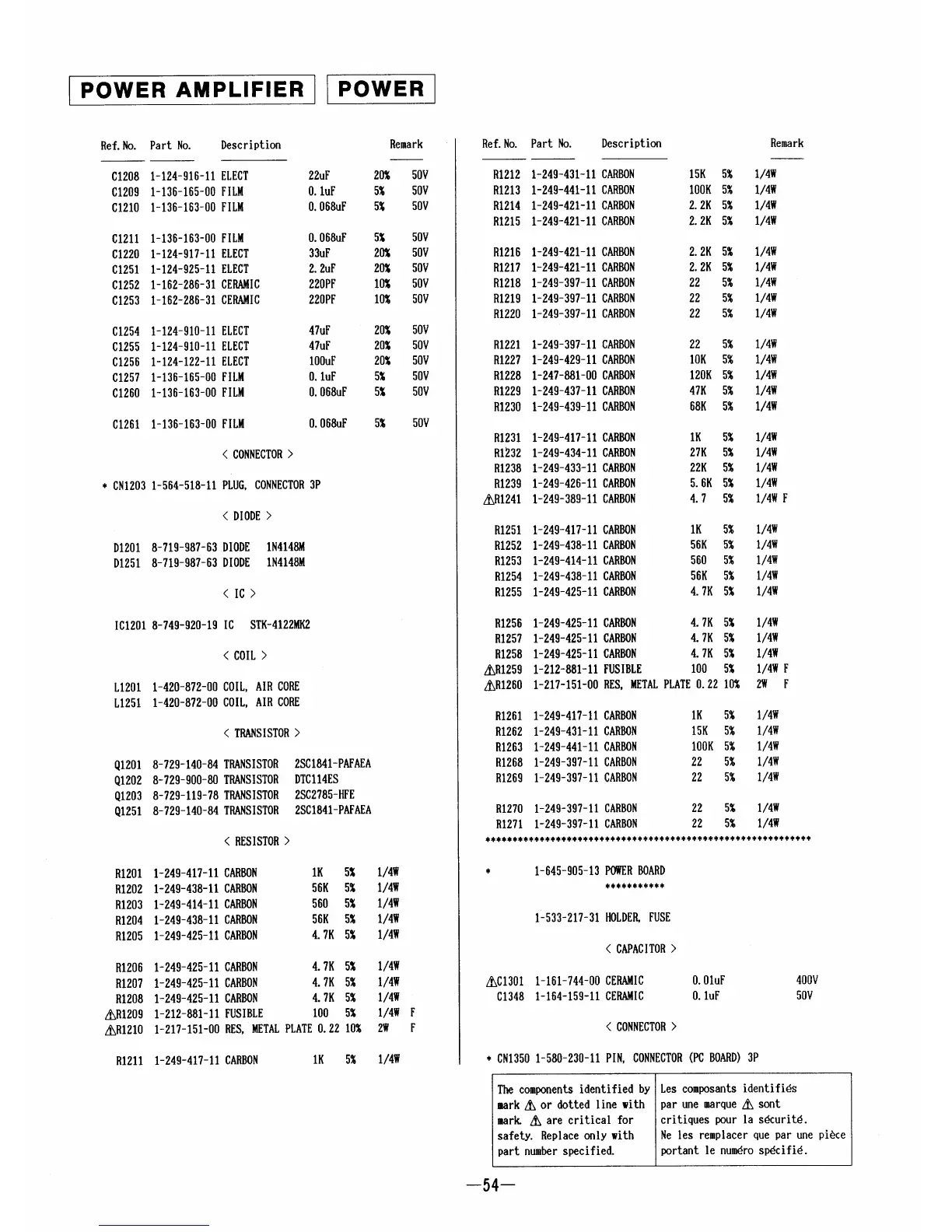 Sony HCD-D109 - Electrical Parts List - Power Amplifier Section; Power Amplifier Section Capacitors and Connectors; Power Amplifier Section Diodes, ICs, Coils, Transistors, Resistors