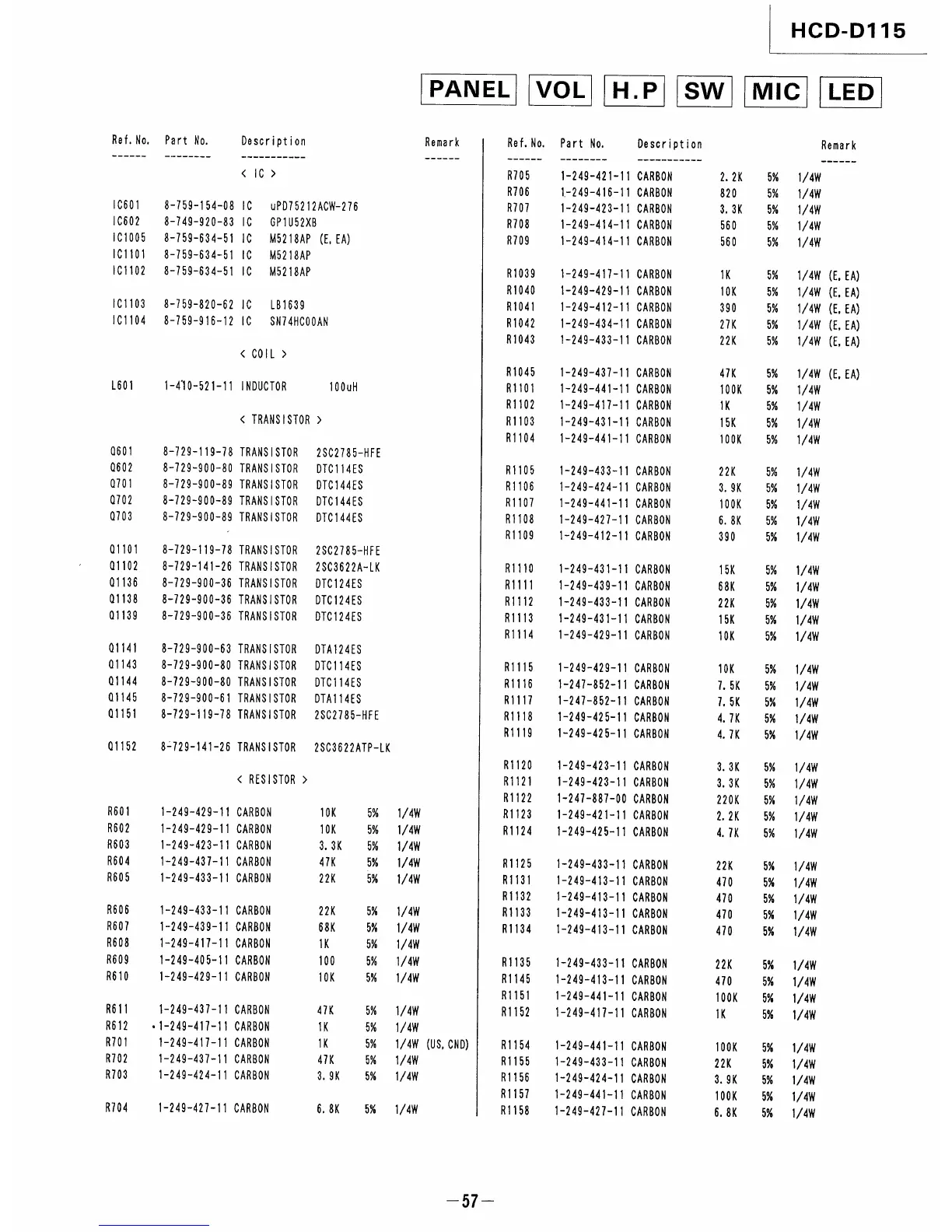 Sony HCD-D115 - PANEL VOL H.P SW MIC LED Parts List (Continued); Panel, Vol, H.P, SW, MIC, LED Resistors, Transistors, ICs, Coils