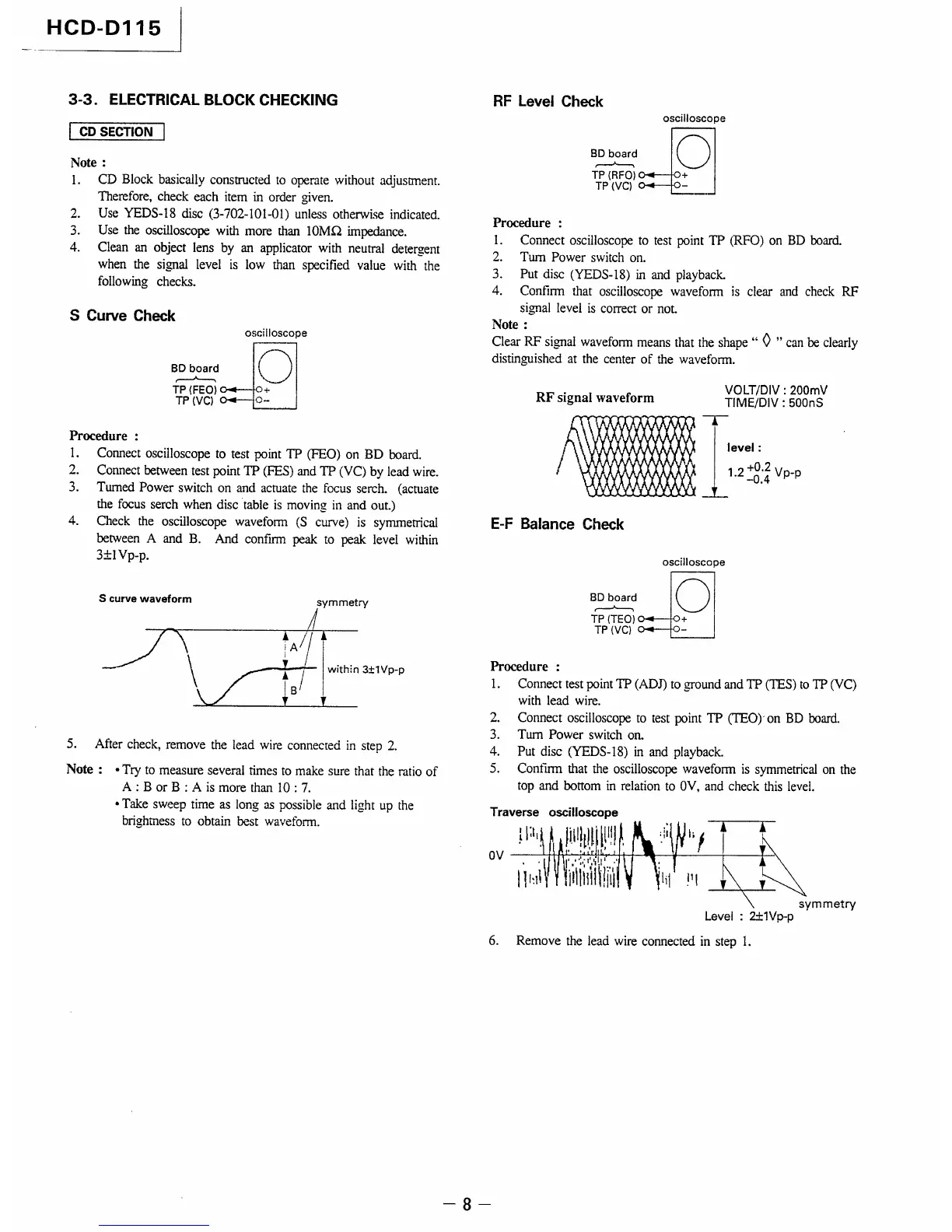 Sony HCD-D115 - SECTION 3-3. ELECTRICAL BLOCK CHECKING; CD SECTION Electrical Checks; CD S Curve Check Procedure; CD RF Level Check Procedure