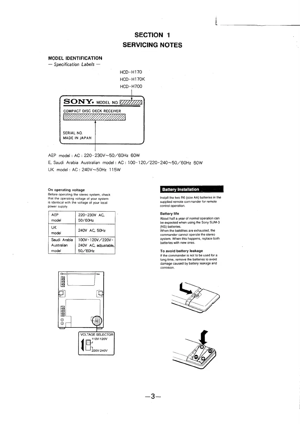 Sony HCD-H170 - SERVICING NOTES; Model Identification and Voltage Check