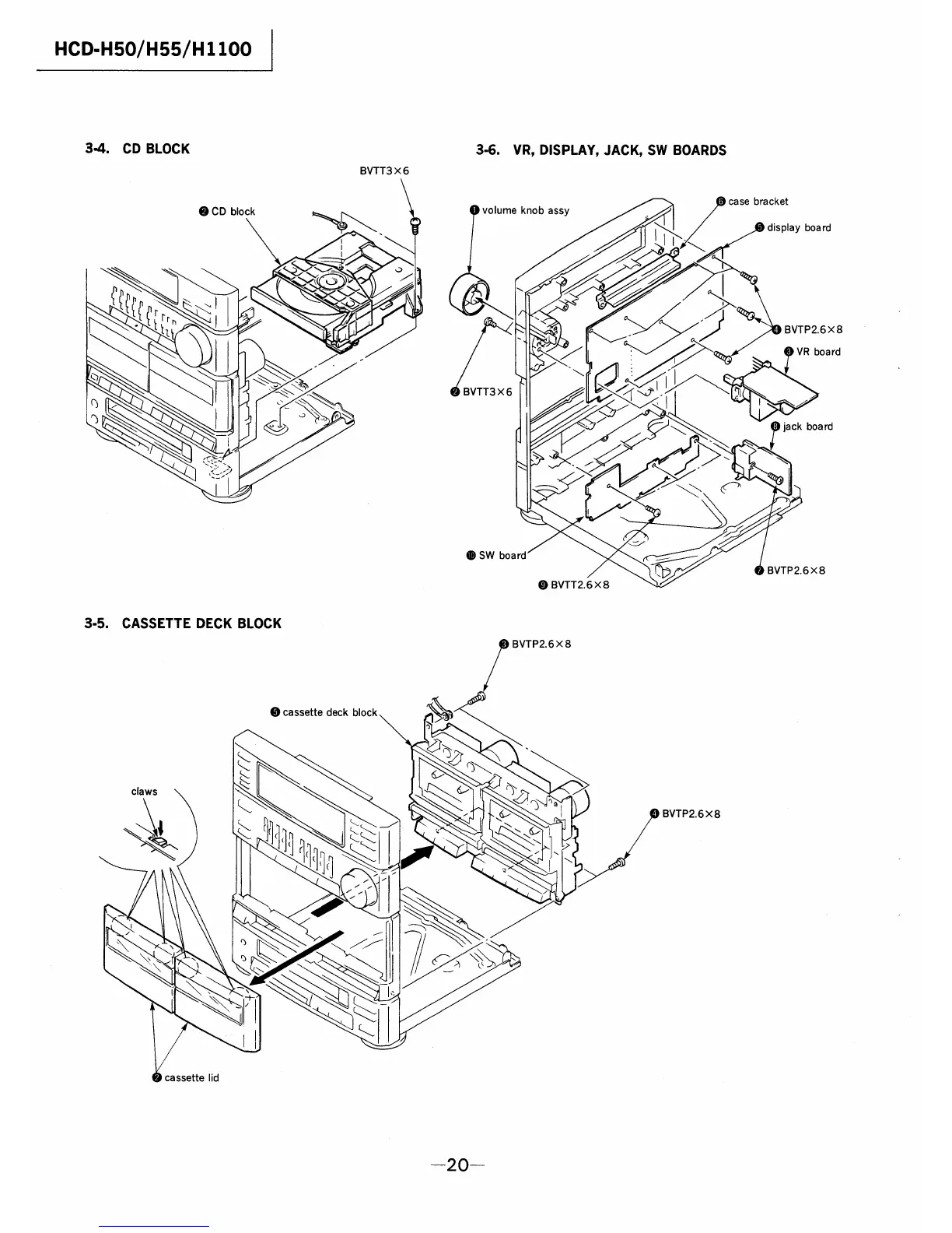 Sony HCD-H50 - Component Disassembly; CD Block Disassembly; Cassette Deck Block Disassembly; VR, Display, Jack, SW Boards Disassembly
