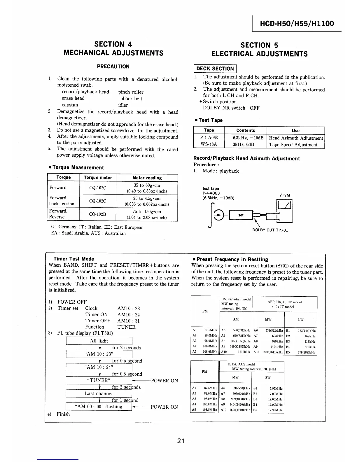 Sony HCD-H50 - Mechanical Adjustments; Mechanical Adjustment Precautions; Electrical Adjustments; Deck Section Adjustments