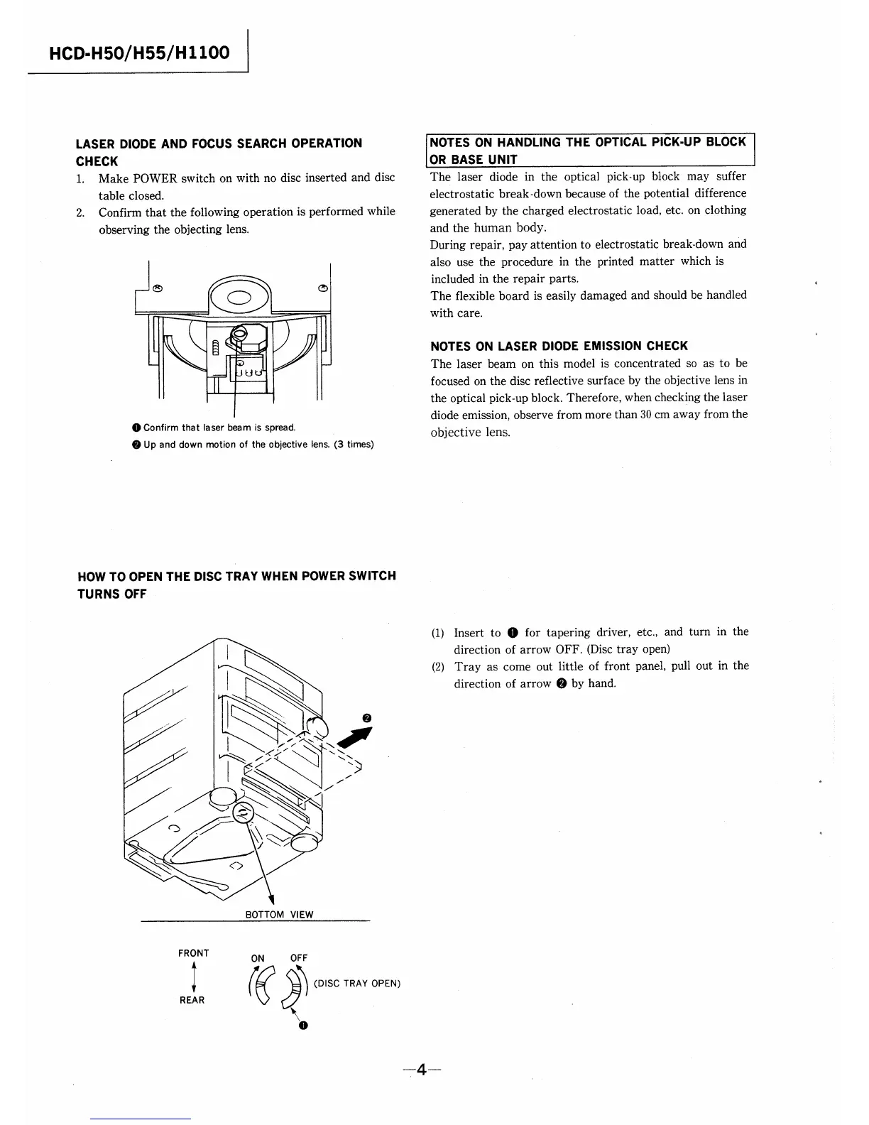 Sony HCD-H50 - Laser Operation Checks; Laser Diode and Focus Search Check; Handling Optical Pick-up Block; Laser Diode Emission Check Notes