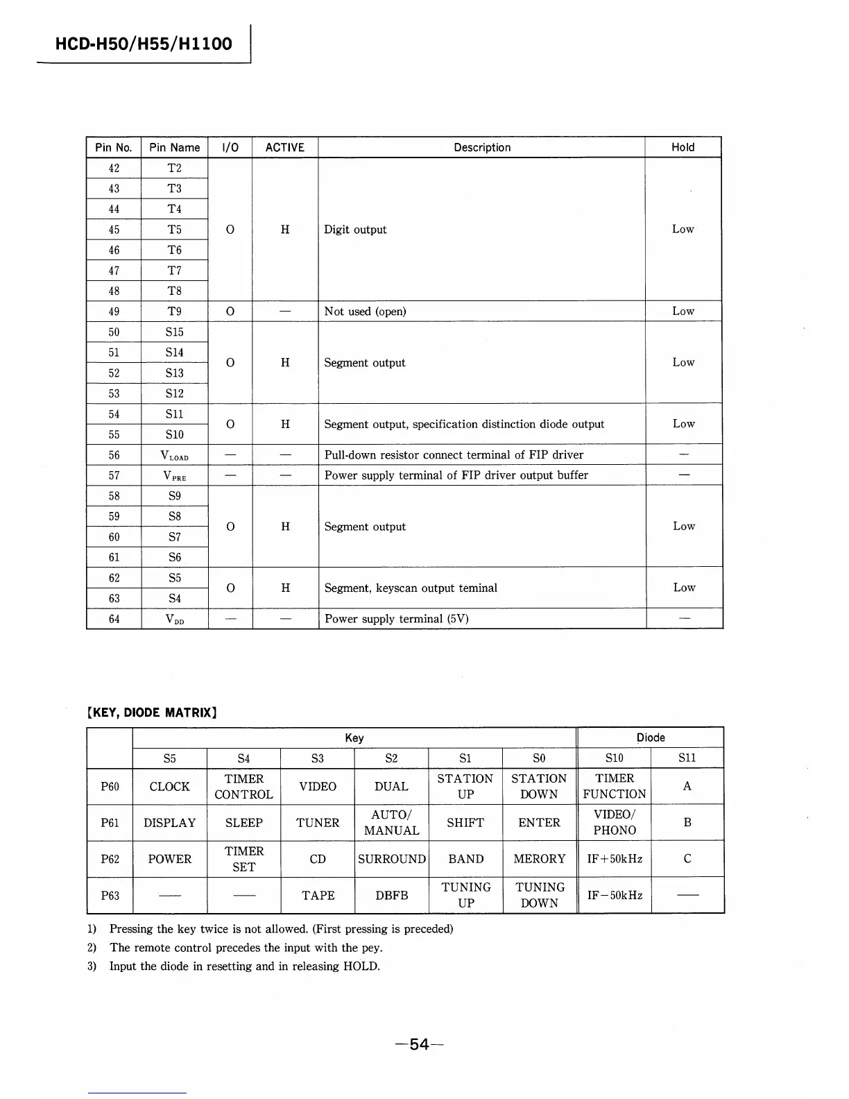 Sony HCD-H55 - IC Pin Functions and Key Matrix; IC201 CD Controller Pin Functions; Key and Diode Matrix Explanation