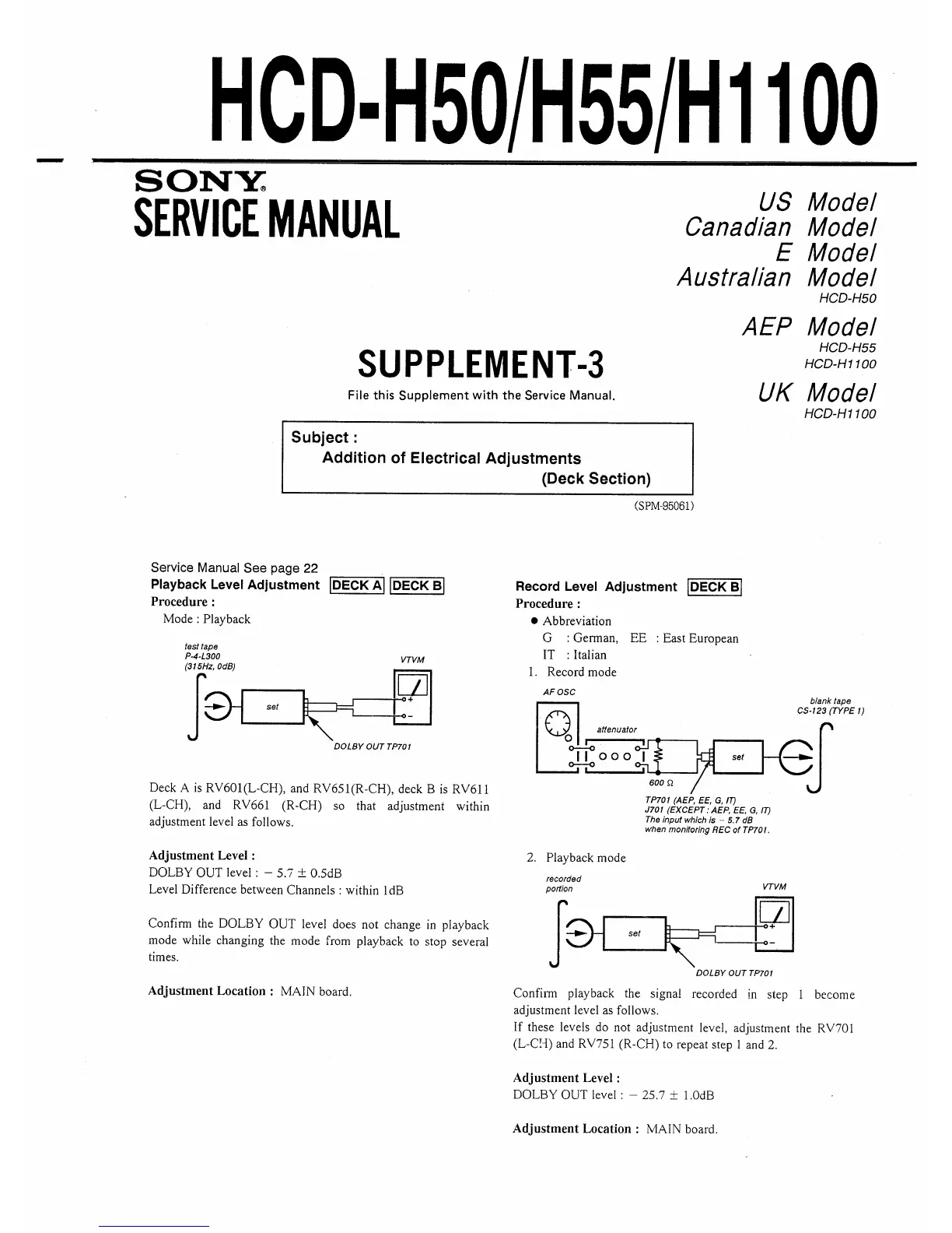 Sony HCD-H55 - Deck Section Electrical Adjustment Additions; Playback Level Adjustment Procedure; Record Level Adjustment Procedure