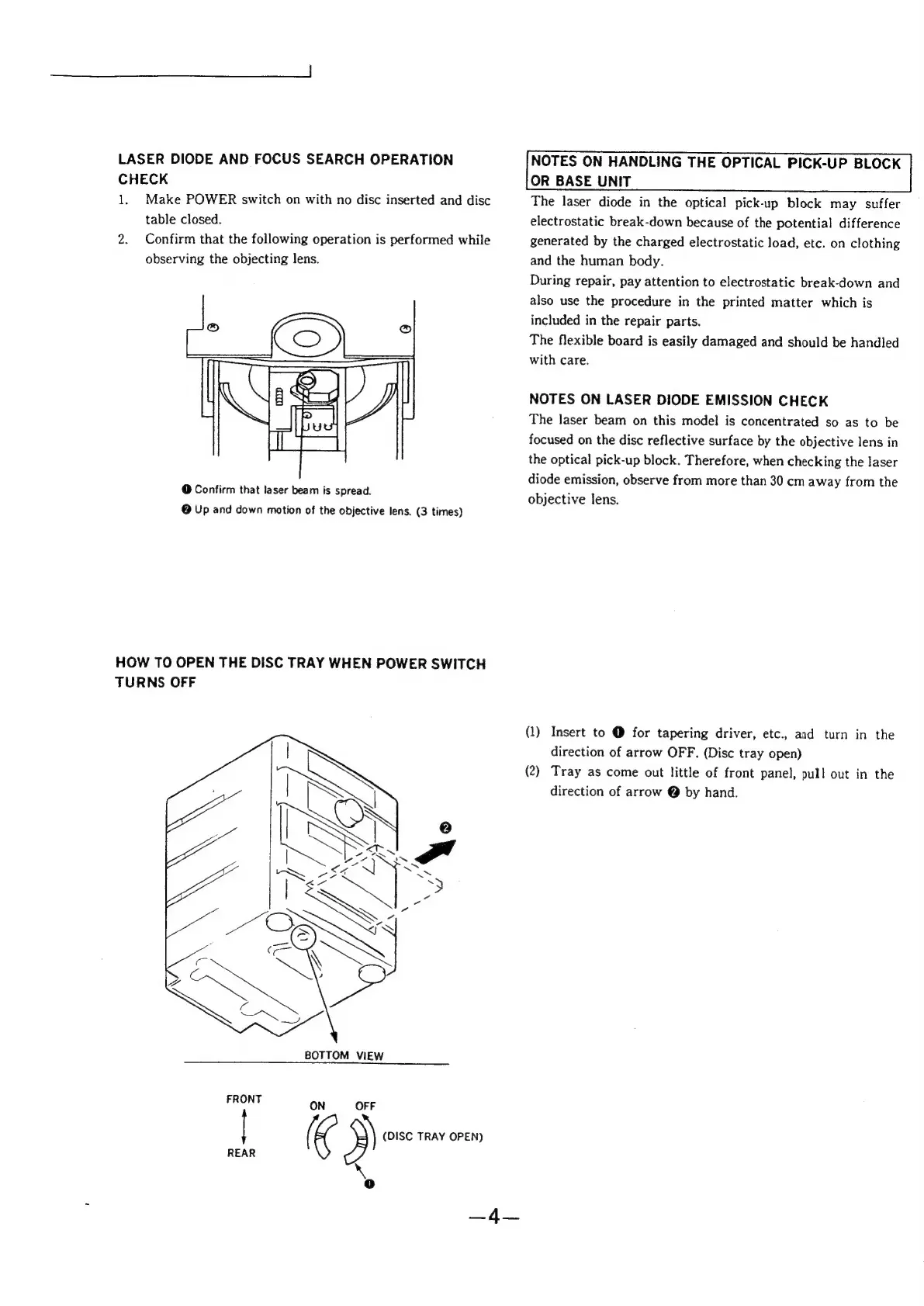 Sony HCD-H700 - LASER DIODE AND FOCUS SEARCH OPERATION CHECK; NOTES ON HANDLING THE OPTICAL PICK-UP BLOCK OR BASE UNIT; HOW TO OPEN THE DISC TRAY WHEN POWER SWITCH TURNS OFF