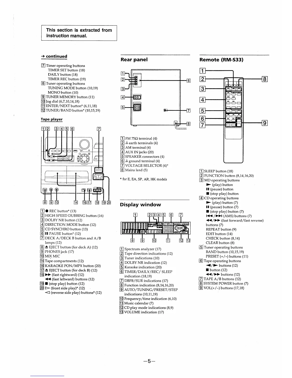 Sony HCD-H701 - Rear Panel; Remote (RM-S33); Display Window; Tape Player Controls