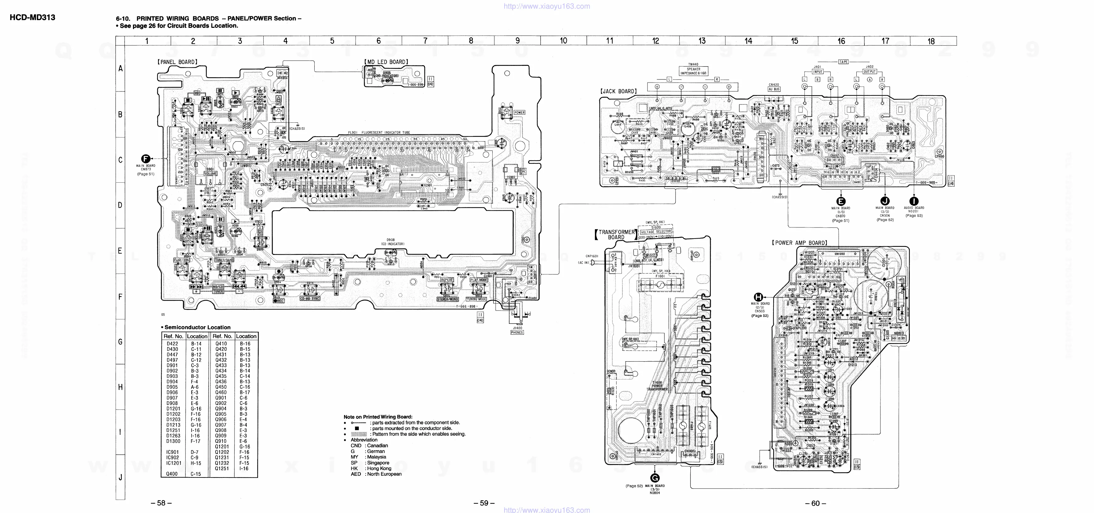 Sony HCD-MD313 - Panel and Power Section Printed Wiring Boards; Panel Board Layout; MD LED Board Layout; Jack Board Layout