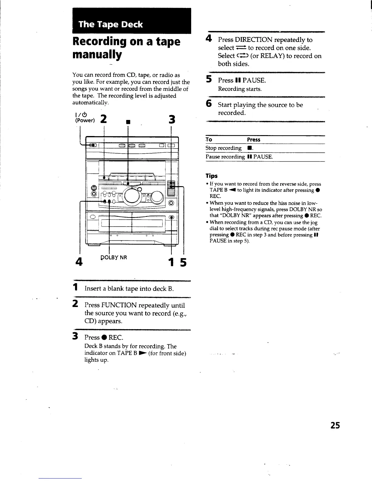 Sony HCD-RX66 - The Tape Deck; Recording on a Tape Manually