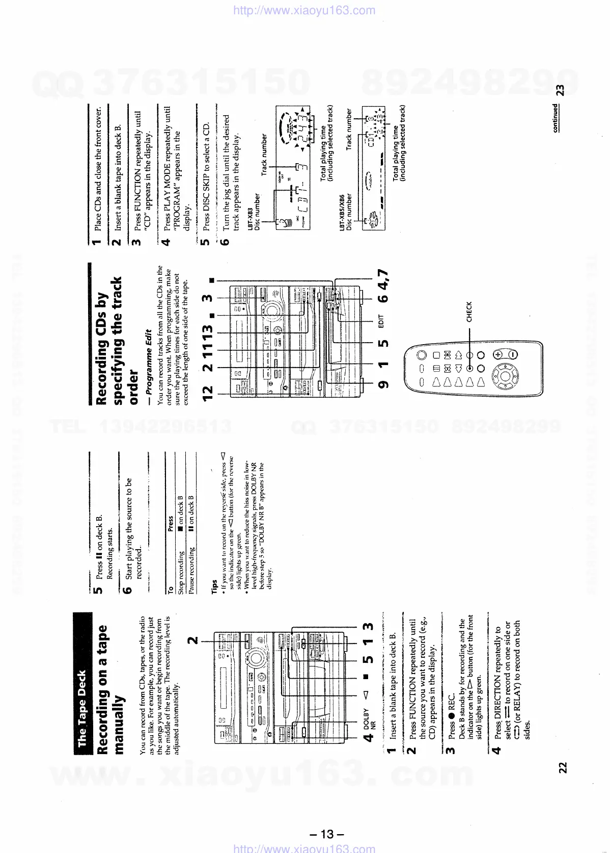 Sony HCD-xb5 - Programme Edit; Recording Cds by Specifying the Track Order; Recording on a Tape Manually; The Tape Deck