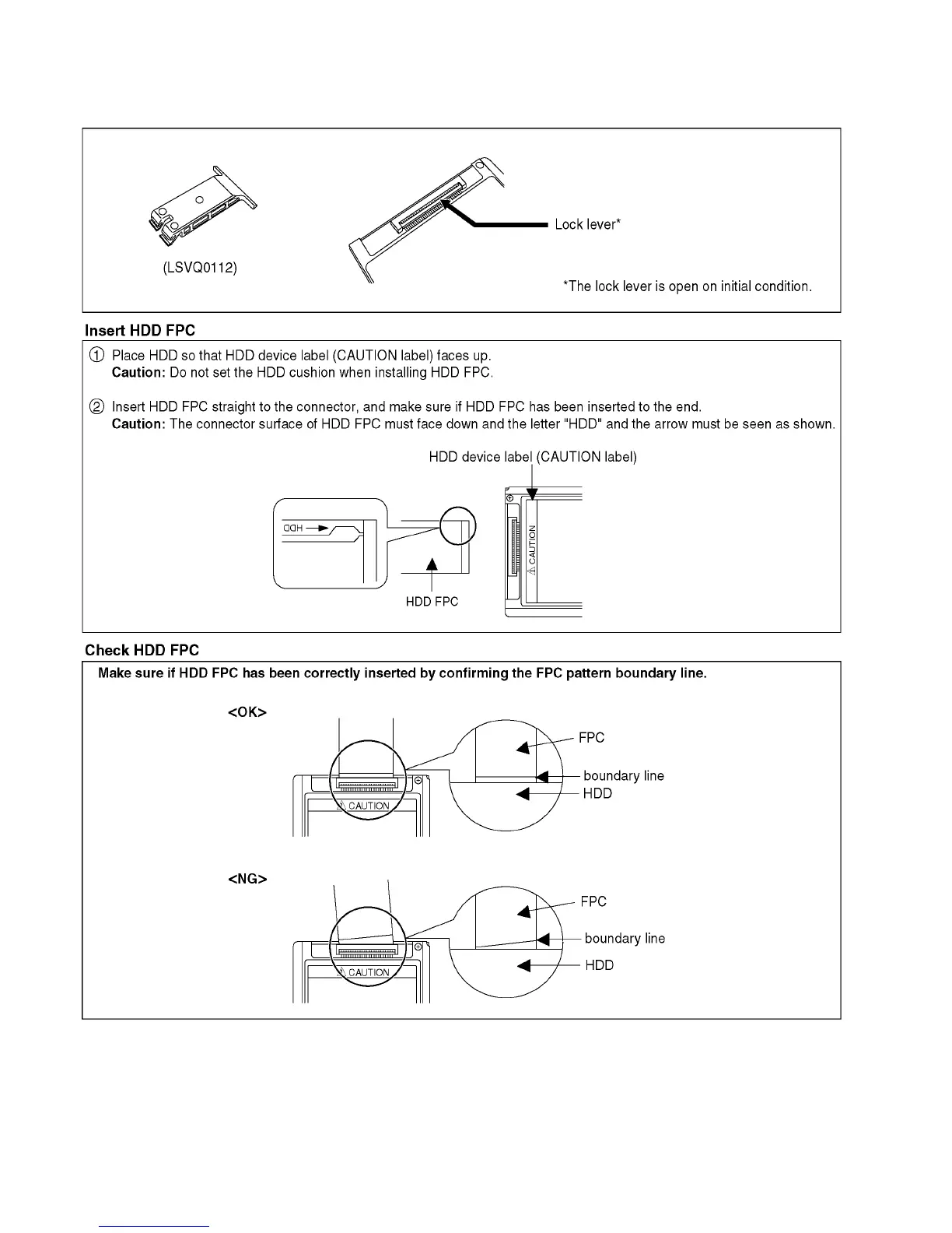 Do not lock the lock lever without inserting HDD FPC. Otherwise, the connector may be damaged.
