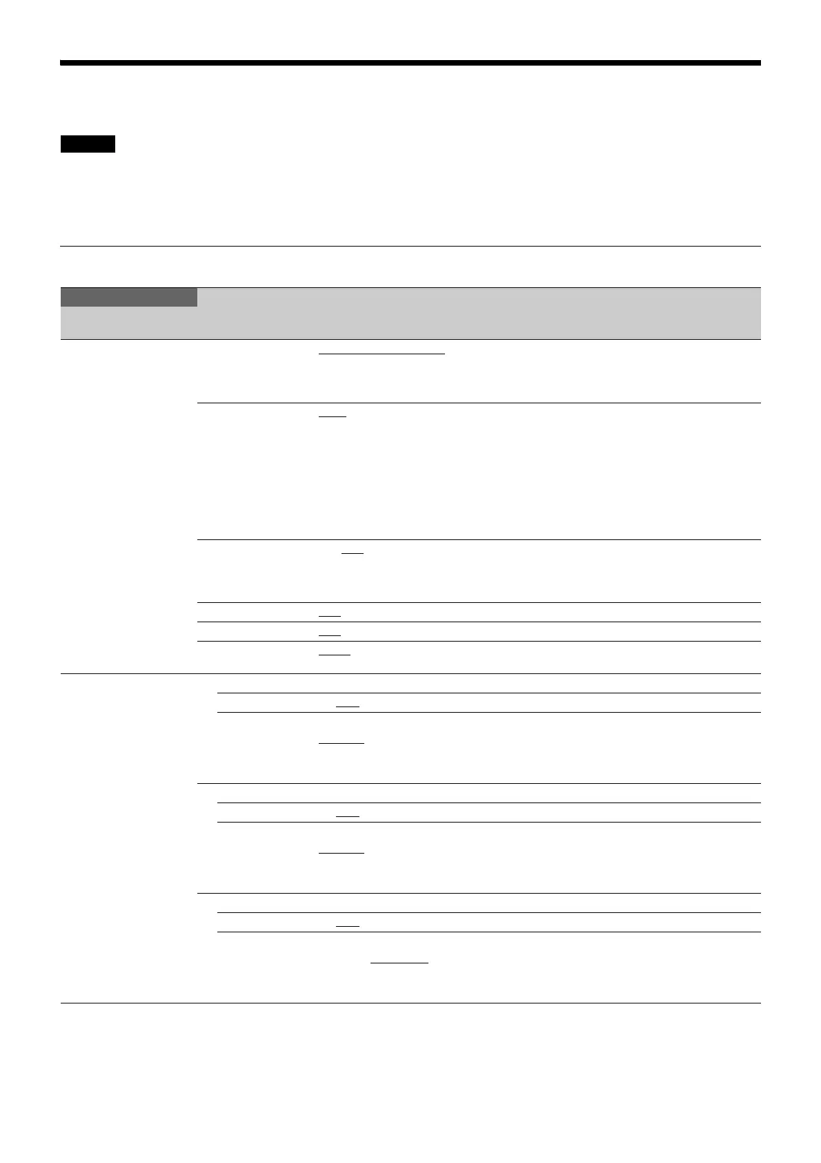 Settings column values (e.g. ON, OFF, 0): Default settings are underlined