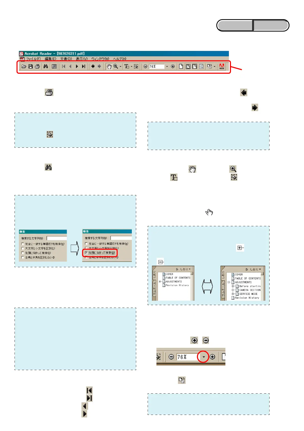 【AdobeAcrobatReaderVer5.0(forWindows)ツールバー内にある主なボタンの機能説明】