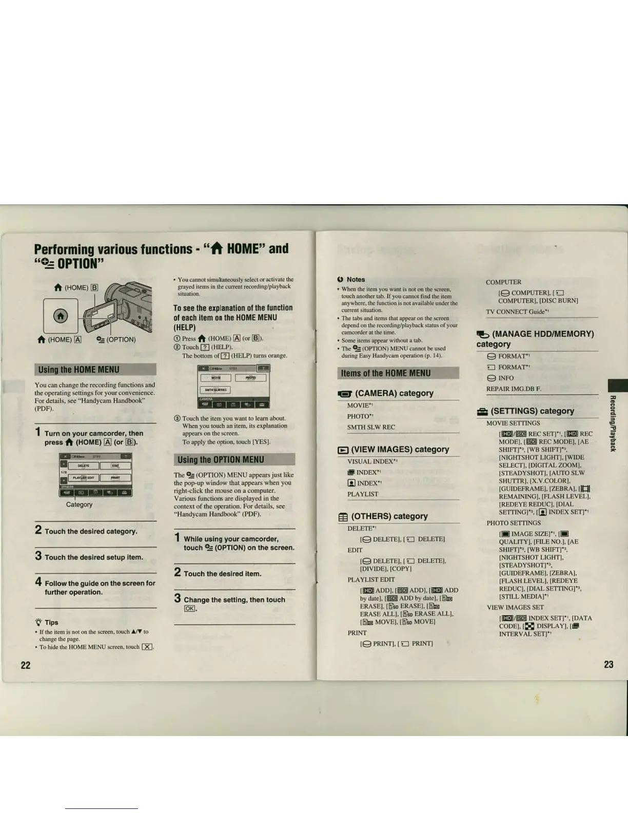 Sony HDR-SR7 - Performing Functions; Using the HOME Menu; Using the OPTION Menu