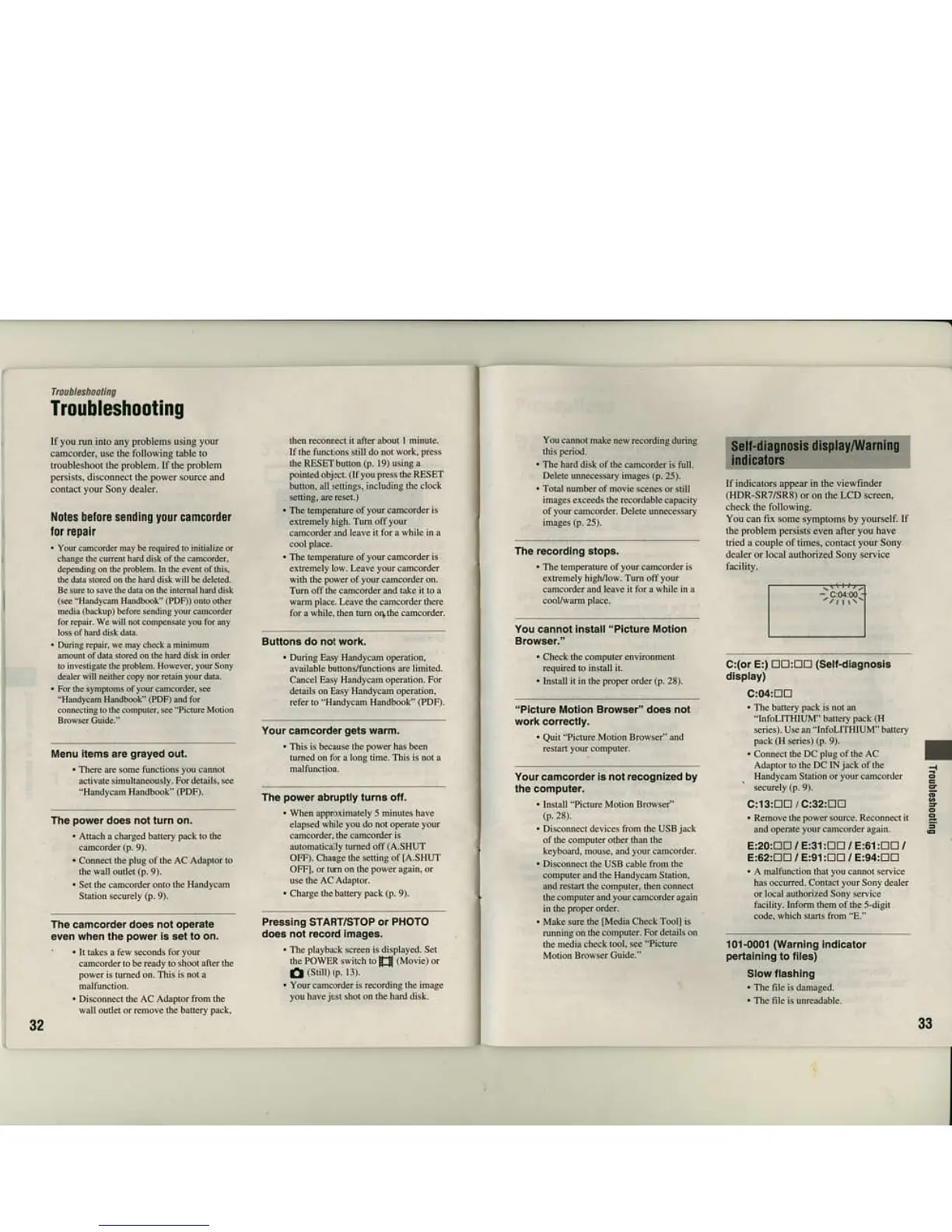 Sony HDR-SR7 - Troubleshooting; Common Troubleshooting Steps; Specific Problem Solutions; Self-Diagnosis and Warning Indicators