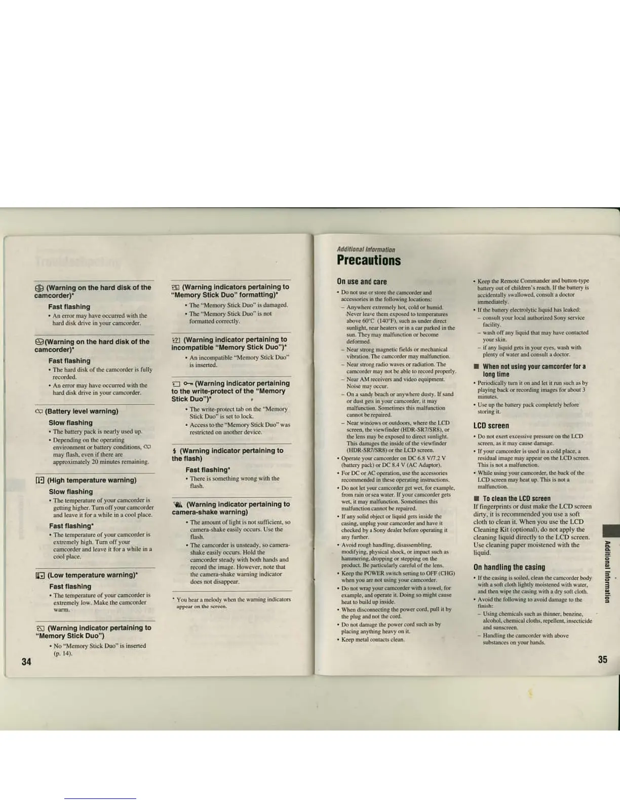 Sony HDR-SR7 - Warning Indicators Details
