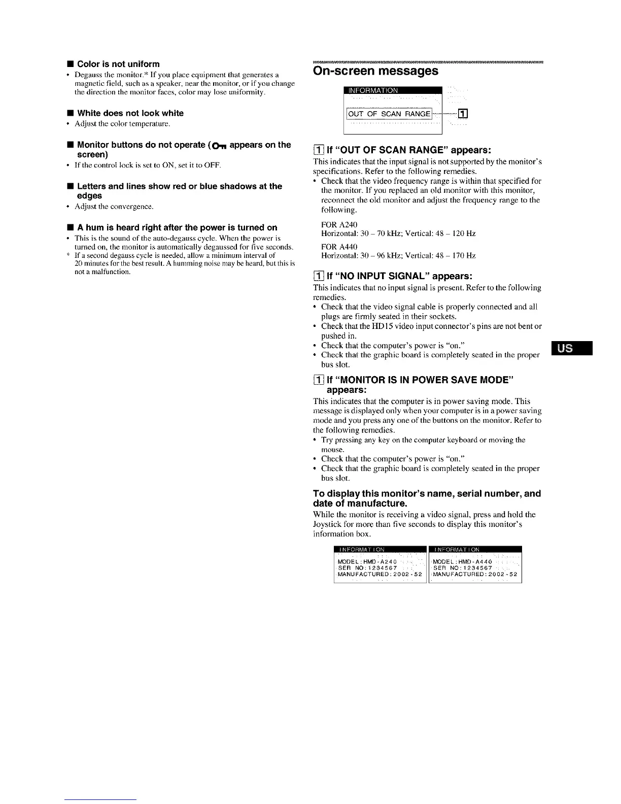 To display this monitor's name, serial number, and