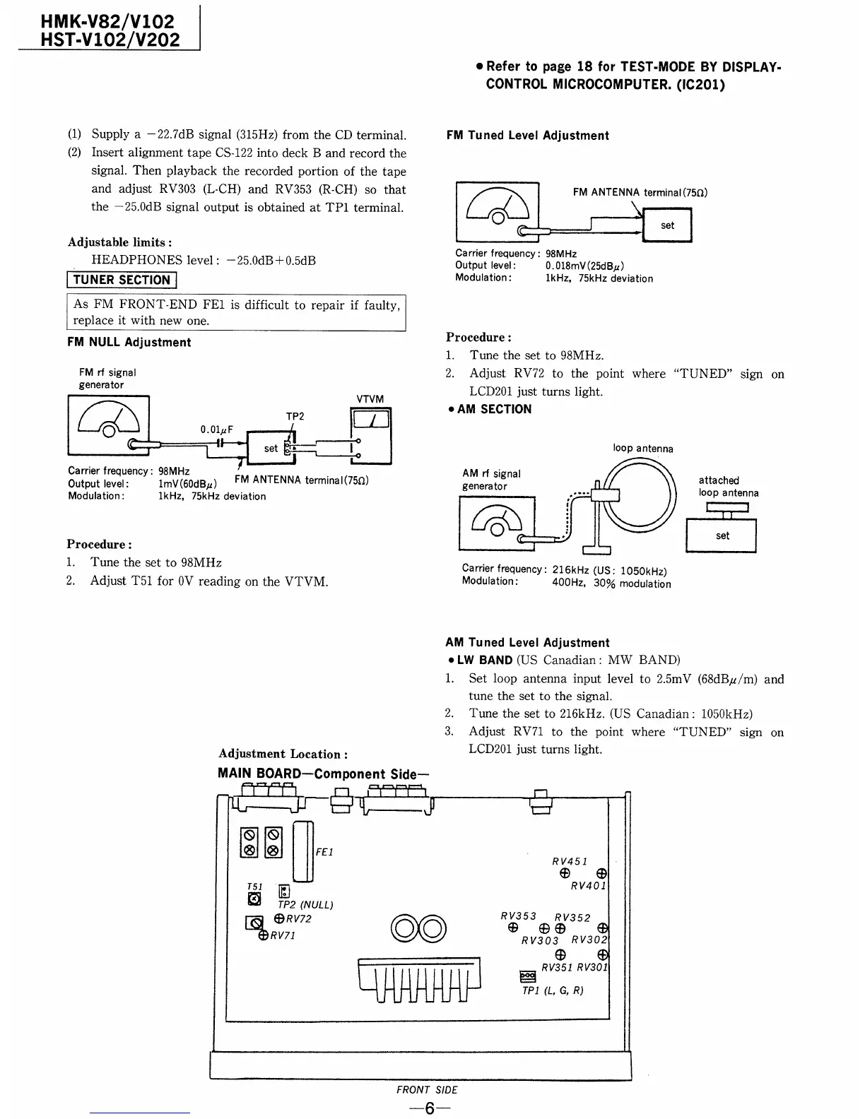 Sony HMK-V82 - FM NULL Adjustment; FM Tuned Level Adjustment; AM Tuned Level Adjustment
