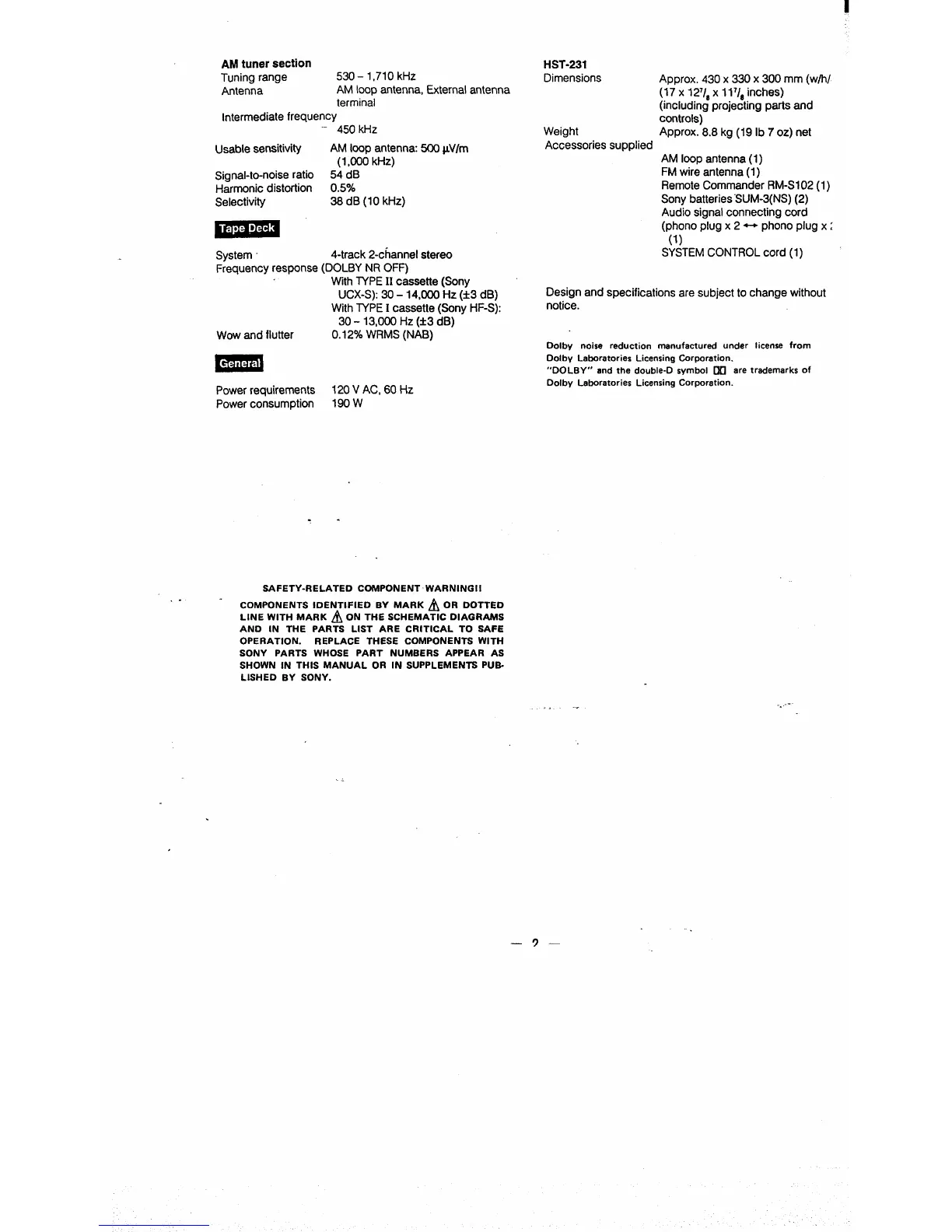 Sony HST-231 - SAFETY-RELATED COMPONENT WARNING!