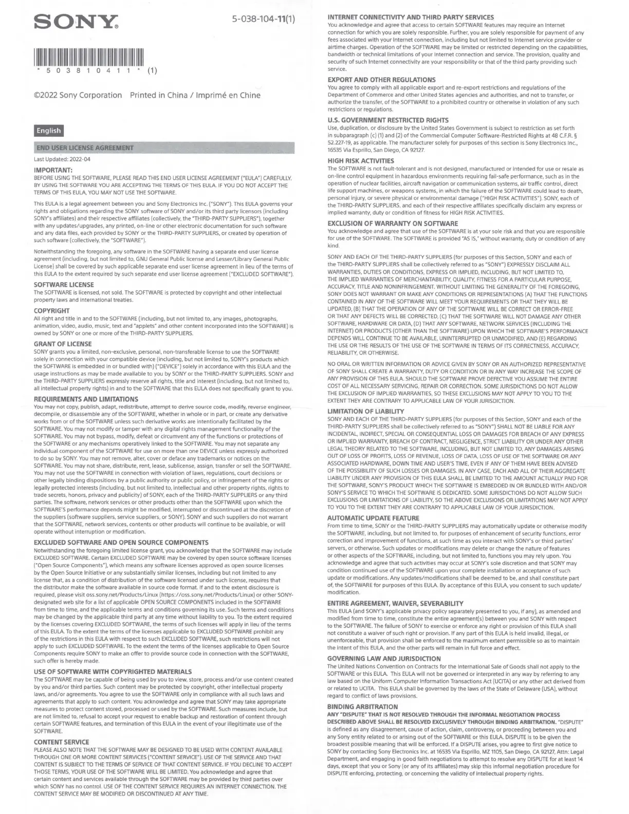 ©2022 Sony Corporation Printed in